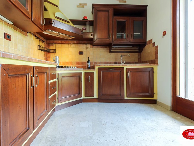 Zona giorno: ampio salone con cucina in muratura a vista, balconata lato strada e caminetto a pellets con bocchettoni di aria forzata.