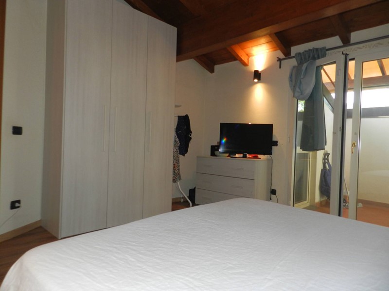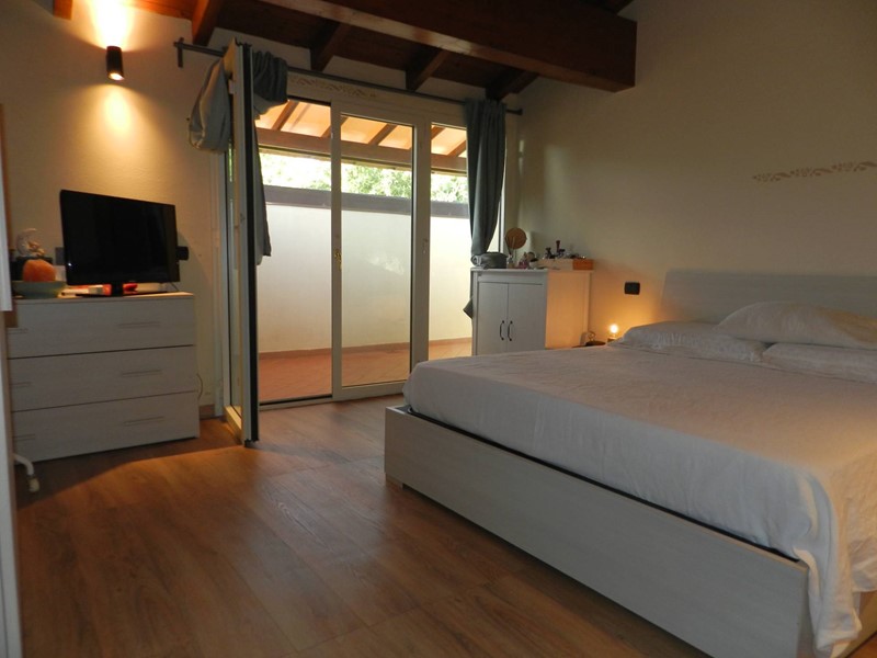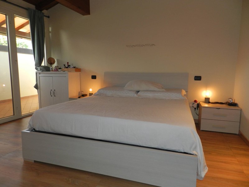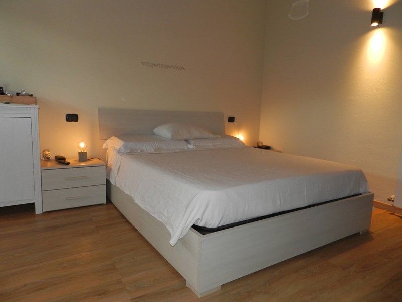 La zona notte, disimpegnata da un corridoio con soppalco utile per riporre oggetti, ospita una camera matrimoniale con accesso alla terrazza, una camera singola (oggi cabina armadio) e un bagno finestrato con vasca e parete in cristallo, utilizzabile anche come doccia.
