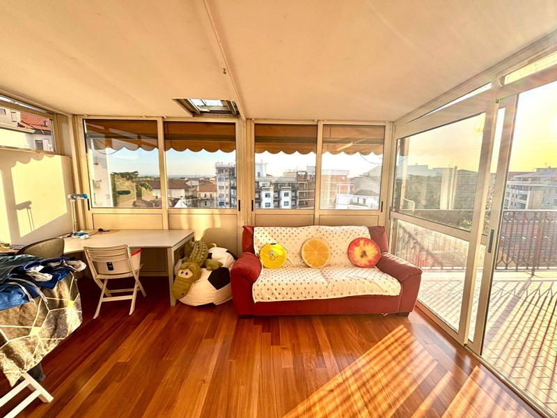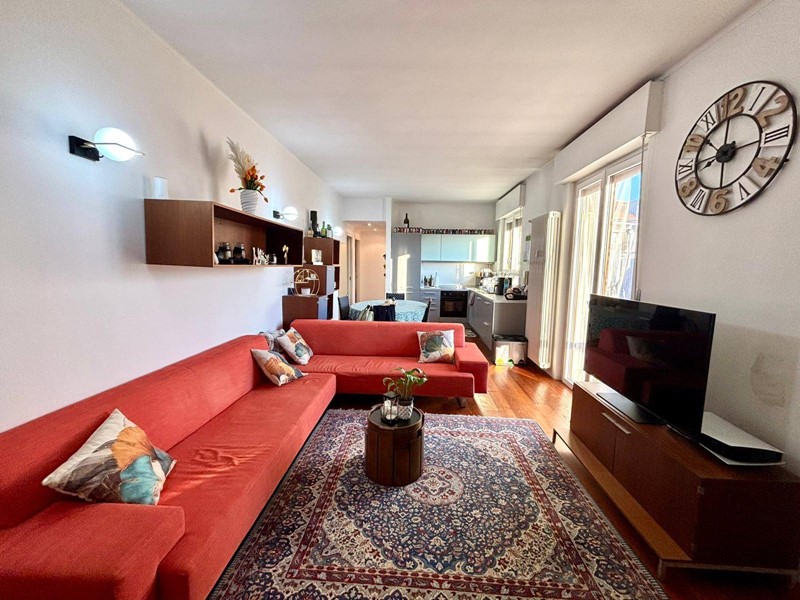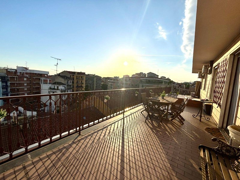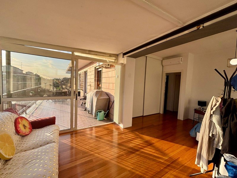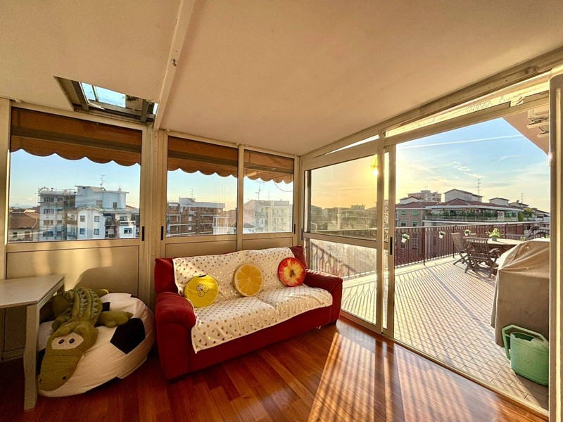 Alloggio completamente RISTRUTTURATO e composto da: Ingresso su un'accogliente zona living con ampio soggiorno e cucina a vista abitabile che affacciano su un grandissimo terrazzo di circa 40 mq, 2 camere da letto, bagno ampio con box doccia doppio, balcone verandato, cantina e BOX AUTO.