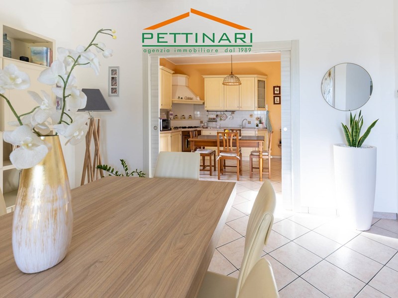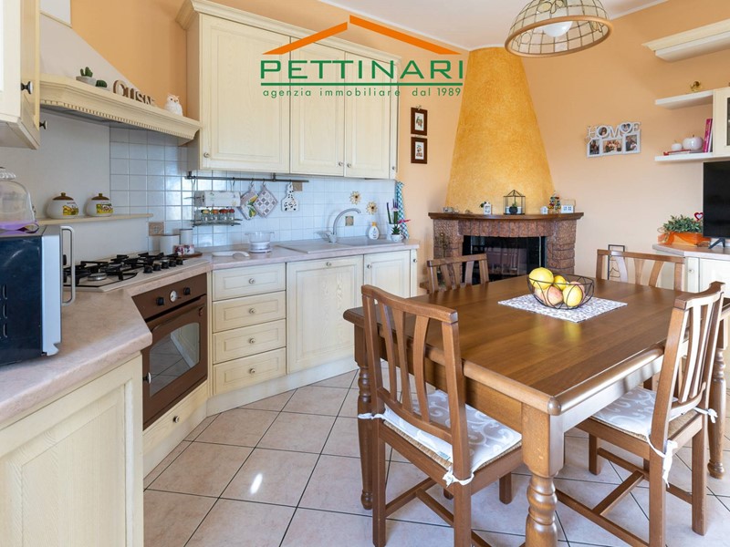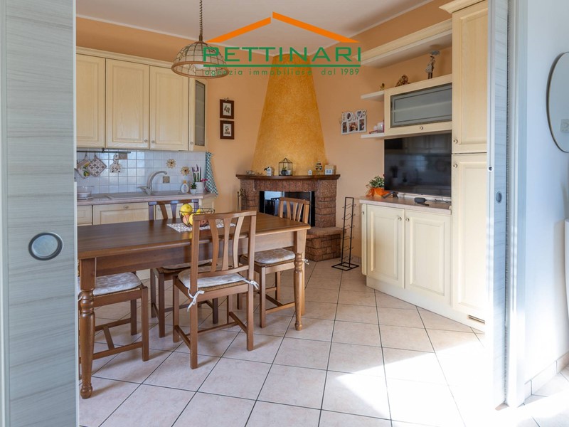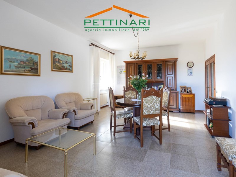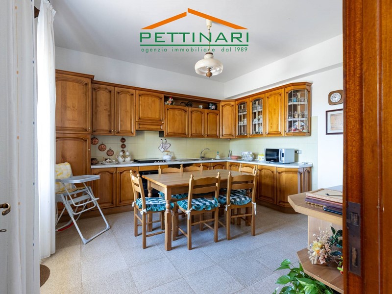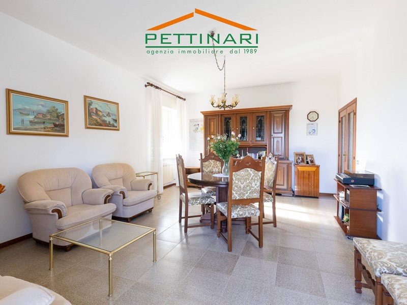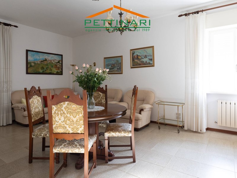 L'appartamento al primo piano, molto luminoso, è stato completamente e modernamente ristrutturato ed è composto da : ampio soggiorno, sala pranzo, cucina abitabile con camino, zona notte con parquet, 1 matrimoniale e 2 camere singole, 2 bagni con doccia, terrazzo panoramico e sottotetto in comune.