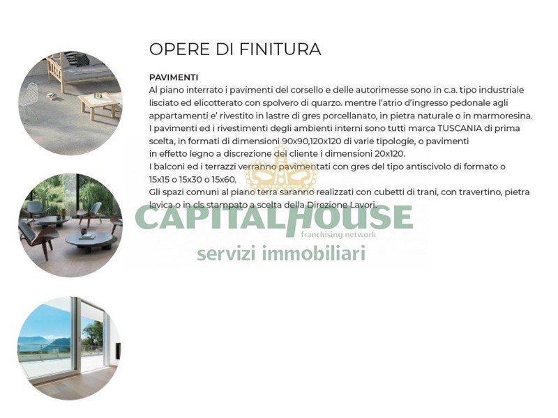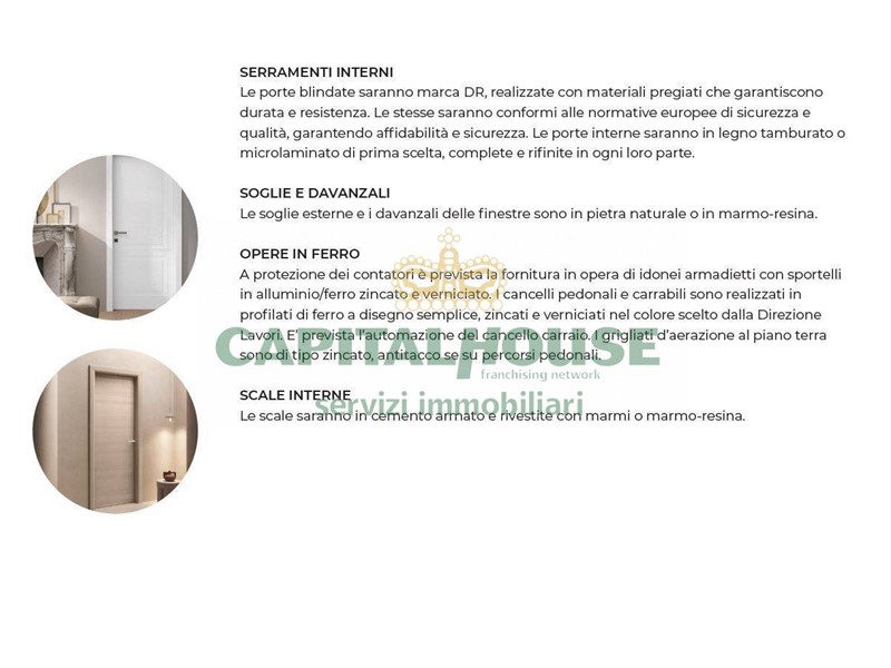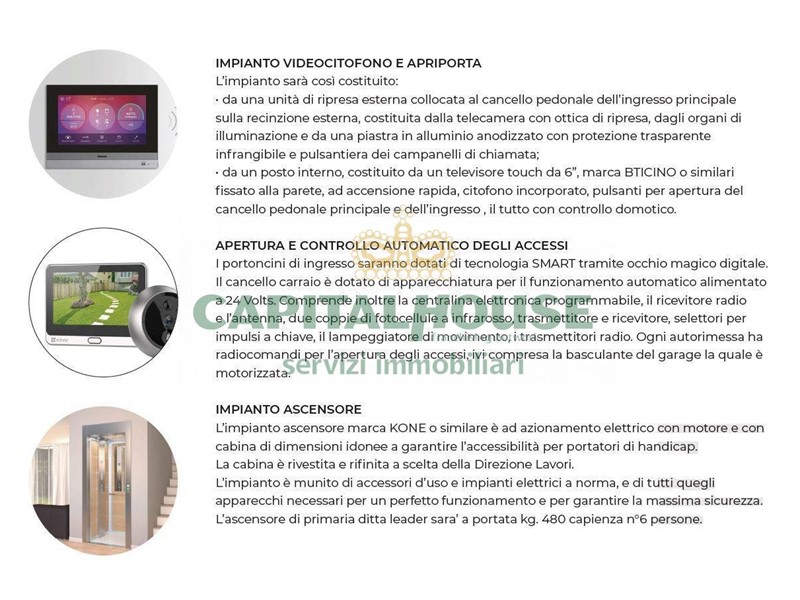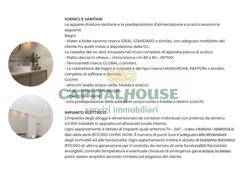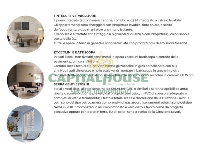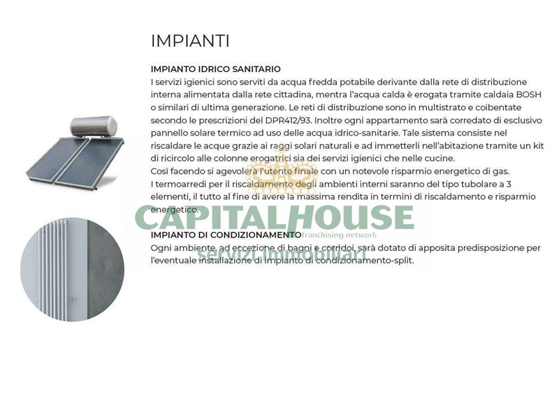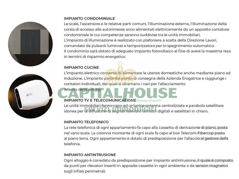 Gli appartamenti saranno realizzati con ottime rifiniture e secondo le più innovative tecnologie in materia di risparmio energetico, saranno dotati di solare termico, fotovoltaico condominiale, avvolgibili e basculante garage motorizzati, impianto Smart per controllo e gestione da remoto dellappartamento oltre che predisposizioni per impianto di condizionamento e antiintrusione.