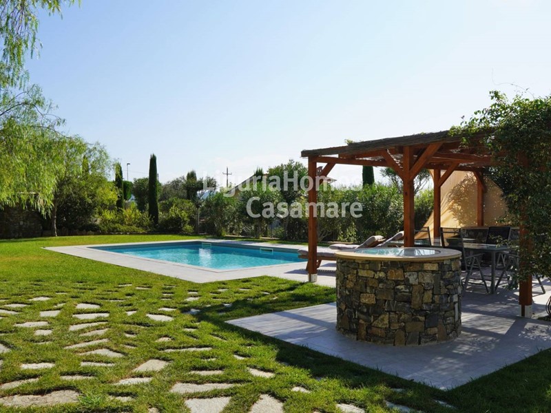 Il giardino è un vero spettacolo: il prato all'inglese e le piante scenografiche lo adornano con maestria, mentre una splendida piscina, incastonata come un diamante, sorge accanto a una pittoresca zona pranzo esterna attrezzata e ombreggiata, ideale per godersi momenti di relax in una cornice unica.