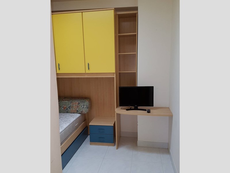 L'immobile è internamente composto da: ingresso su soggiorno con zona cucina, disimpegno, camera matrimoniale e cameretta, antibagno più bagno lievemente mansardato (finestrato con doccia), ripostiglio e due balconi per totali mq. 10 circa (uno a servizio della zona giorno e l'altro nella camera matrimoniale).