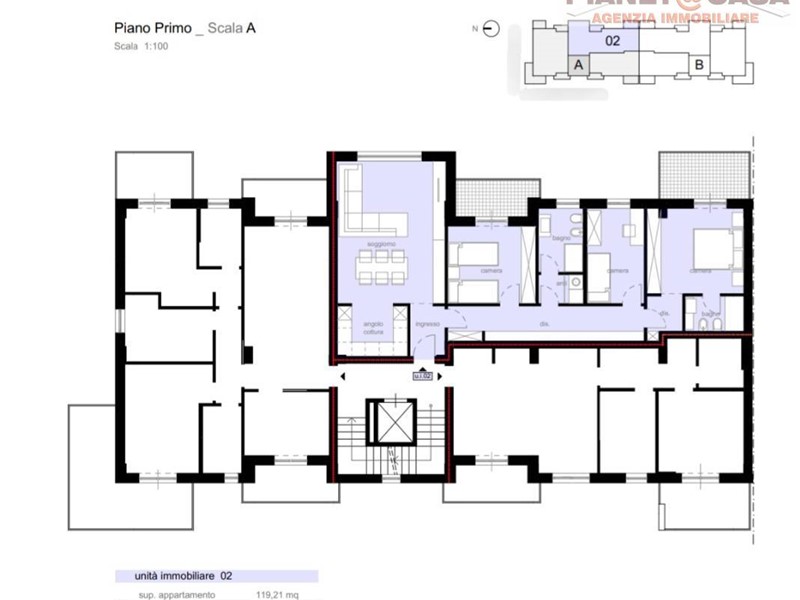 Appartamento al primo piano di circa 119 mq (oltre 2 balconi per totali 13 mq) con ingresso su soggiorno-sala da pranzo, cucinotto, disimpegno, 3 camere (matrimoniale, doppia e singola), 2 bagni (uno finestrato con antibagno ed uno ad aerazione forzata). I balconi sono a servizio delle due camere principali.