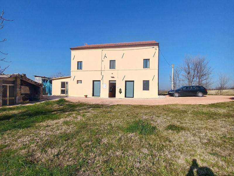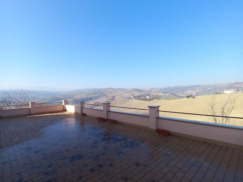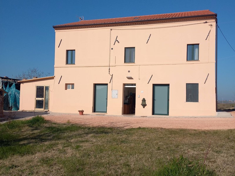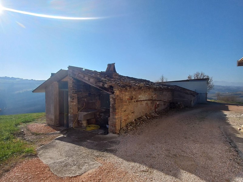 La casa di 330 mq complessibi, disposti su tre livelli di 110 mq a piano, è stata oggetto di recente ristrutturazione ed è abitabile da subito. L'abitazione è dotata di ingresso al piano terra, dove troviamo anche un magazzino di 27 mq adiacente al fabbricato non comunicante, un deposito, una stanza di lavoro, una cantina ed un bagno di servizio, il tutto per una metratura di 110 mq. Dalla scala interna accediamo al primo piano, dove troviamo la parte abitativa costituita da un salone con arco sulla cucina abitabile ed accesso allo splendido terrazzo di 60 mq, zona notte con spazio di distrubuzione, due camere matrimoniali ed un bagno, questo piano è stato completamente restaurato, con rivestimenti, infissi ed impianti nuovi. Al piano secondo troviamo due ampi locali con altezze idone alla trasformazione ad abitativo ma attualmente allo stato grezzo usate come ripostiglio, qui sono solo stati portati gli impianti per un possibile utilizzo, tetto in legno nuovo con travi a vista. Sulla casa sono stati eseguiti lavori di consolidamento ed opere di messa in sicurezza antisismiche, tinteggiatura delle facciate, isolamento termico, impianti nuovi al primo piano, tetto nuovo e sostituzione infissi con finestre di ultima generazione. Sulla corte sussistono due grandi fabbricati, uno di 114 mq a mattoni con il vecchio forno da restaurare, l'altra struttura si tratta di un nuovo fabbricato di 64 mq utilizzabile come rimessa mezzi agricoli. Completa la proprietà un appezzamento di terreno agricolo di 90.000 mq. L'unità immobiliare è sita in aperta campagna, in posizione soleggiata, dominante e panoramica. Montappone dista 30 minuti di auto dalla costa e 60 minuti di auto dalla montagna. Ad un'ora di auto abbiamo il più vicino aeroporto di Falconara.