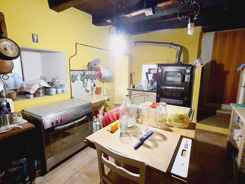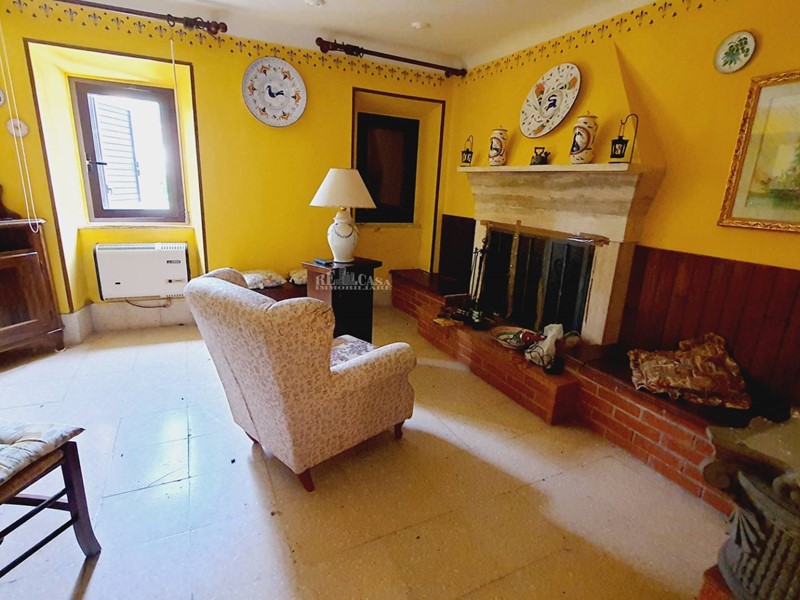 Piano terra con ampio soggiorno stile rustico con rivestimento in pietra, travi in legno a vista e caminetto, cucina abitabile attrezzata con forno a legna, due camere doppie, bagno finestrato con doccia .
