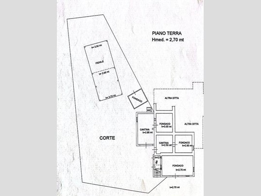 Il piano terra, di 90 mq è composto da quattro vani accatastai come fondaci e cantina, con altezza che varia da 1,5 mt e 3 metri, in aderenza