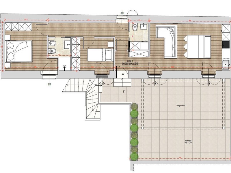 Appartamento 80 mq al piano terra, all'ingresso troviamo ampio soggiorno con cucina a vista, due camere da letto matrimoniali ed un bagno con doccia ad areazione forzata. Completa la proprietà una corte pavimentata di 27 mq con possibilità di pergola in legno già approvata da progetto.