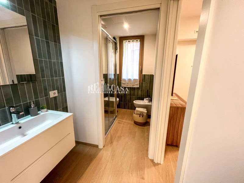 Rifinito con pavimentazione in gres porcellanato effetto parquet sull'intera superficie, infissi in alluminio con doppio vetro a taglio termico con eccellente isolamento termico, tapparelle in alluminio automatizzate con apertura e chiusura, impianto di riscaldamento a pavimento, impianto di raffreddamento a pavimento, pompa di calore, impianto per ricircolo dell'aria, portone di ingresso blindato, zanzariere in alluminio su tutte le aperture, videocitofono, impianto fotovoltaico per ogni appartamento, impianto privo di gas, predisposizione impianto d'allarme. Esposizione nord - est.