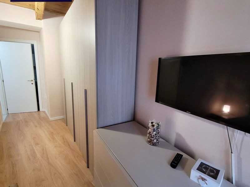 Il soggiorno è spazioso e ben illuminato. L'appartamento è dotato di un bagno con doccia. La camera matrimoniale è molto ampia e accogliente, con finiture di pregio e tutto l'immobile si presenta con travi a vista.