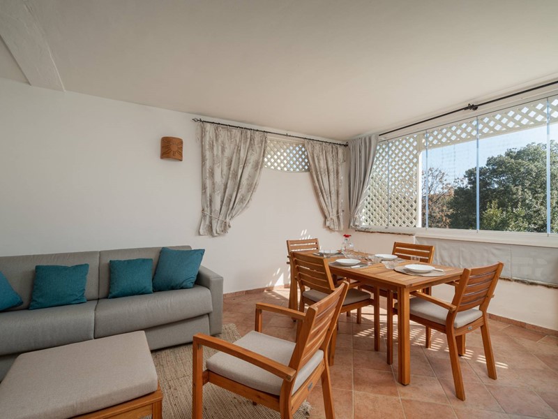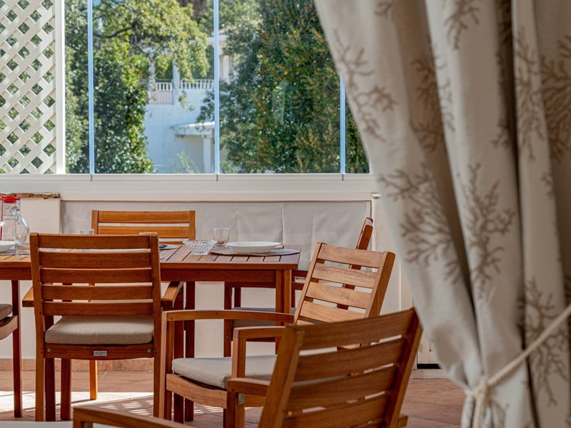 Ampia Veranda Climatizzata: Uno degli elementi distintivi di questa proprietà è la grande veranda, climatizzata e chiusa da vetrate richiudibili. Questo spazio, arredato con un tavolo da pranzo, divano e sedie confortevoli, offre una vista rilassante sul giardino condominiale, trasformandosi in unoasi privata dove godersi le serate estive.