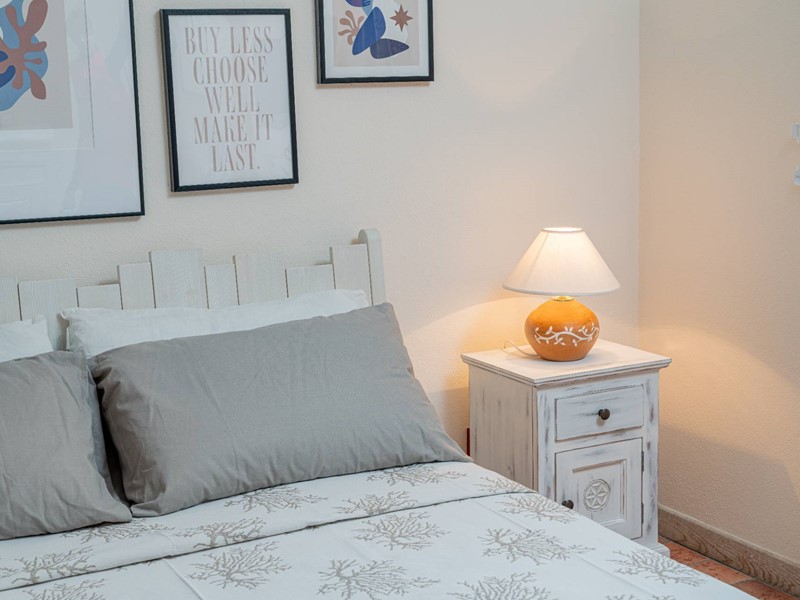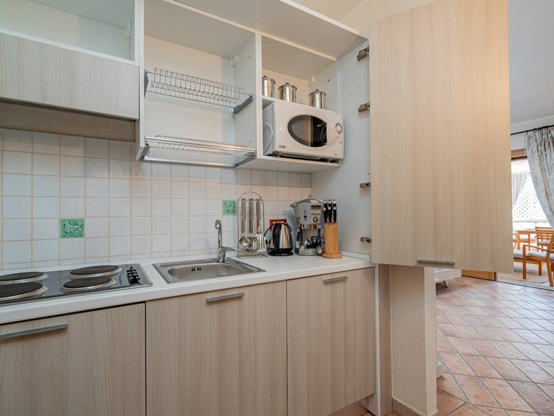 Zona Giorno/Notte: La zona è arredata con un letto matrimoniale comodo e pratico, un mobile TV e un armadio capiente per ottimizzare lo spazio. Langolo cottura a scomparsa, equipaggiato con piano cottura, microonde e frigorifero, è perfetto per preparare pasti leggeri o una cena romantica.