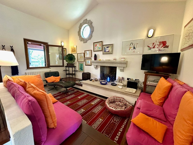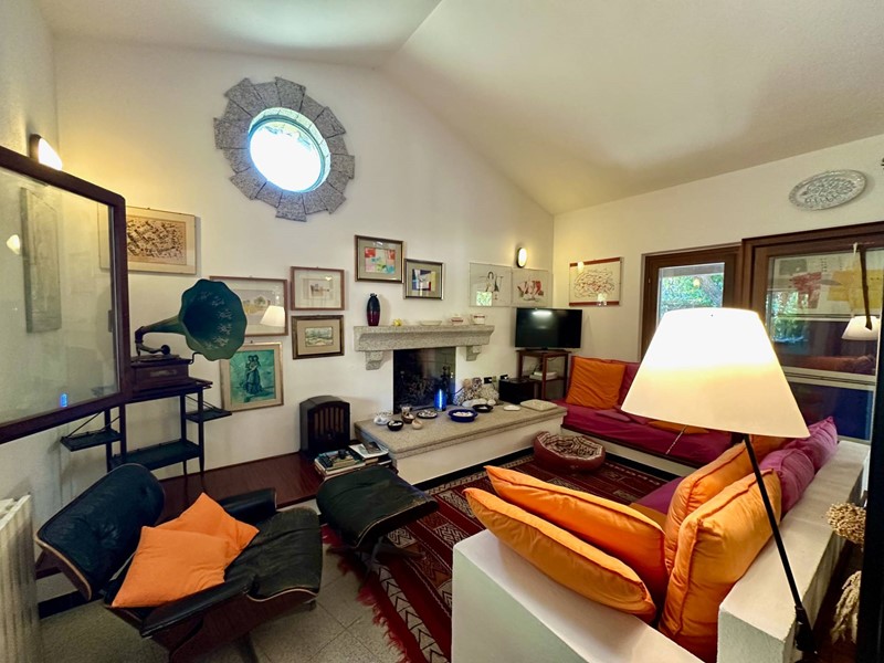Ampio Soggiorno con Zona Pranzo: Un ambiente accogliente e luminoso, ideale per rilassarsi o intrattenere ospiti, con ampie vetrate che collegano gli spazi interni al giardino.