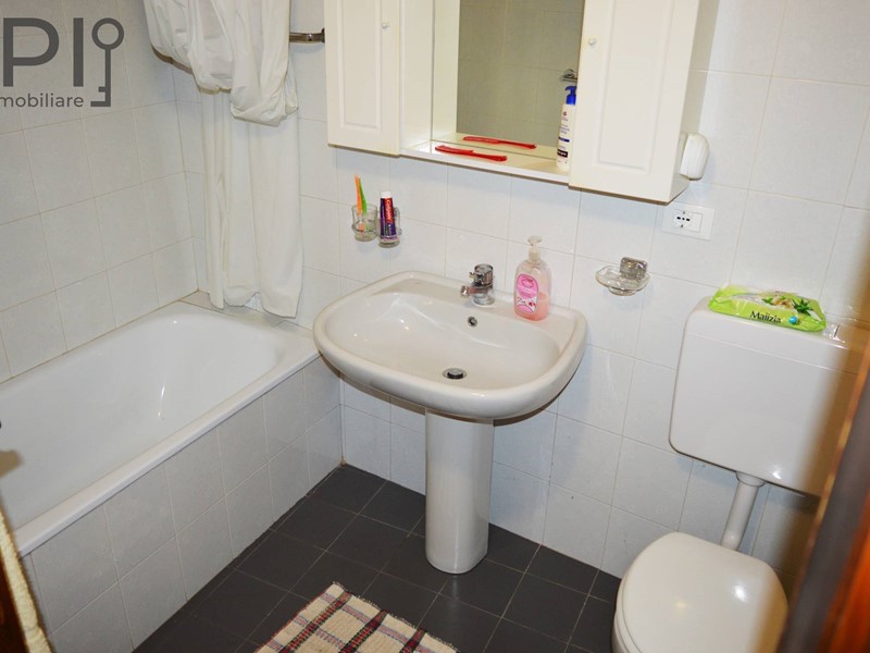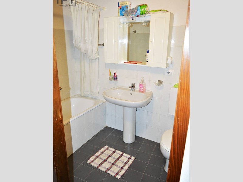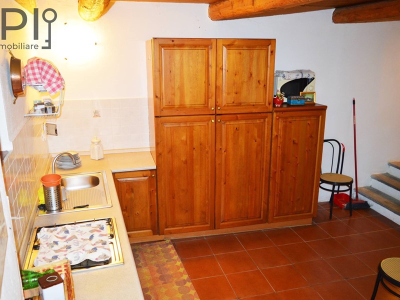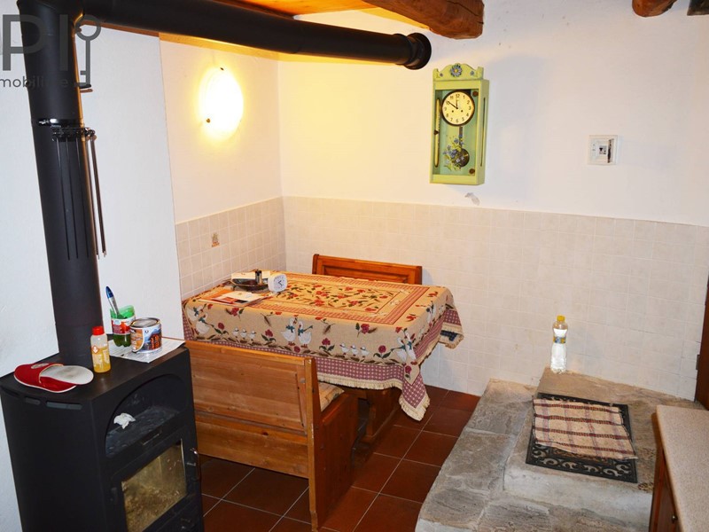 Ingresso su cucina con stufa a legna e pavimento in cotto, vano sottoscala adibito a ripostiglio e bagno moderno con vasca doccia.