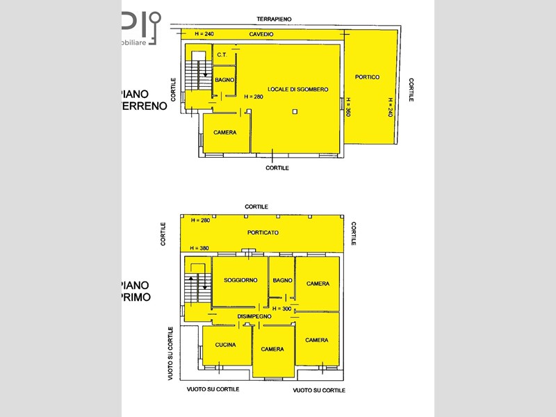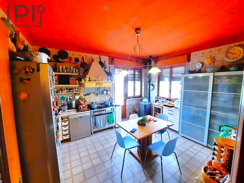 Al piano primo la parte abitativa importante con ingresso da scala che introduce ad un bel corridoio che distribuisce gli spazi in cucina con un bel terrazzo angolare, un grande salone, due camere da letto, uno studio o camera da letto, un bagno. Dal salone si accede ad un bel porticato esterno, collocato sulla parte posteriore, che da accesso al terreno prativo sul retro ed al noceto.