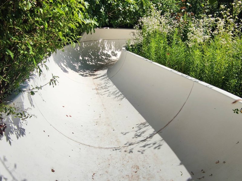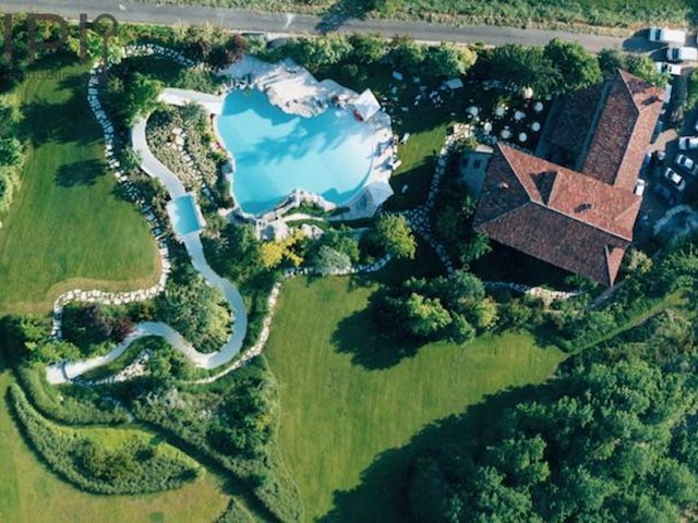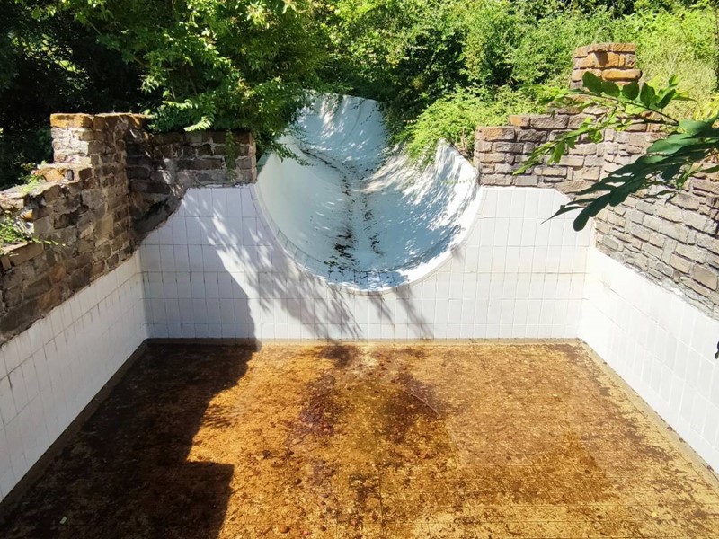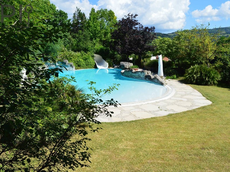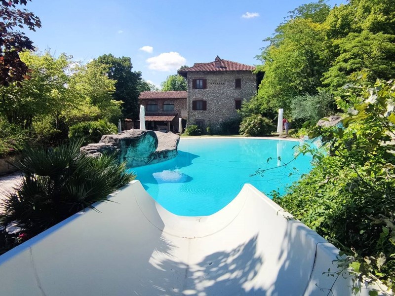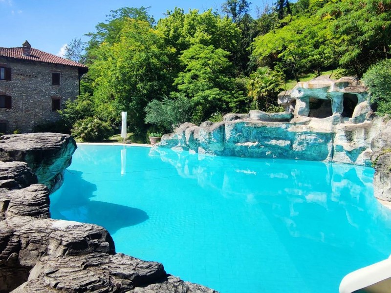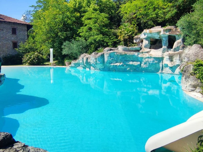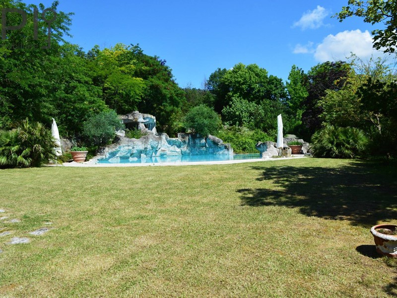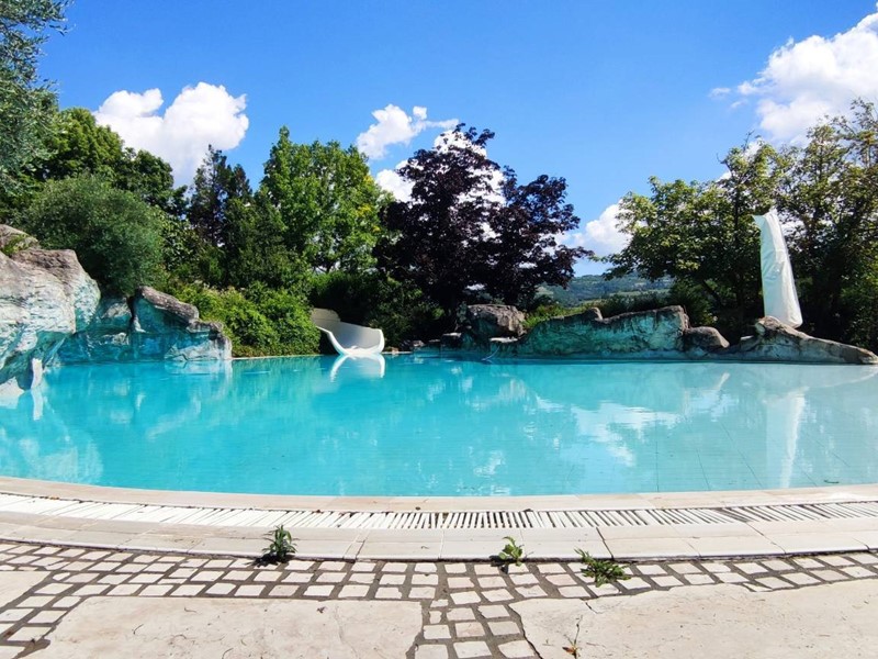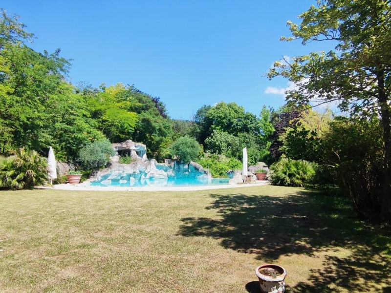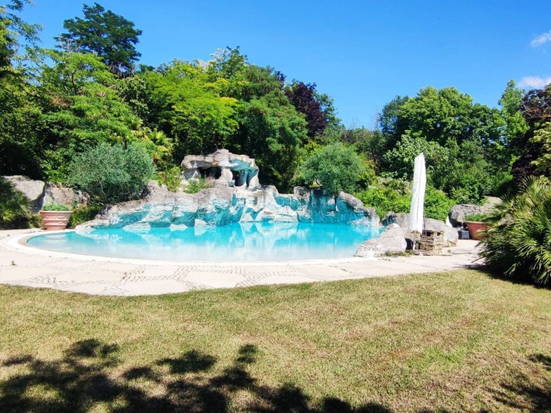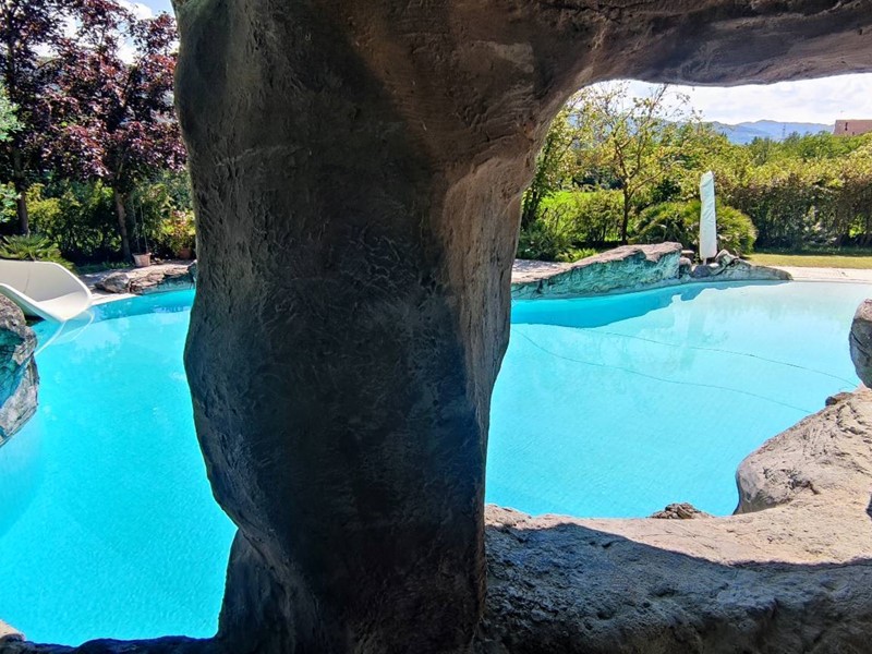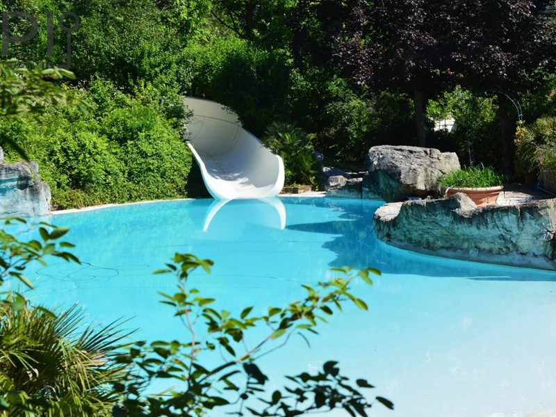 Questultima si trova di fronte alla casa ed è tematizzata con rocce a sfioro, scivolo acquatico che scende dal terreno in pendenza per circa 60 m. con piscinetta intermedia per rallentare la corsa e zona solarium che continua nel giardino curatissimo e con oltre 7000 rose. Impianto di irrigazione su tutto il terreno, tramite la sorgente di proprietà. Sulla sommità della collina che circonda la proprietà campo da tennis/calcetto.