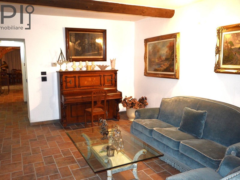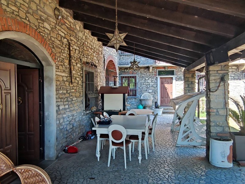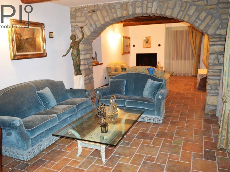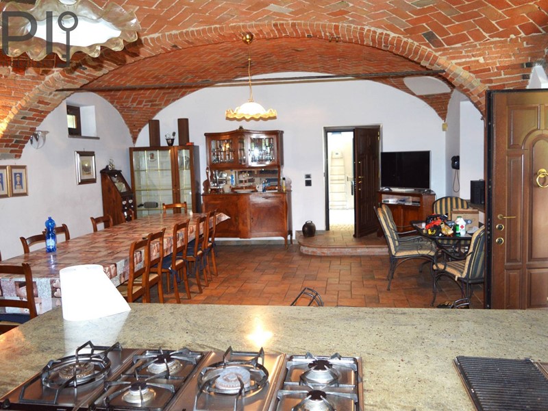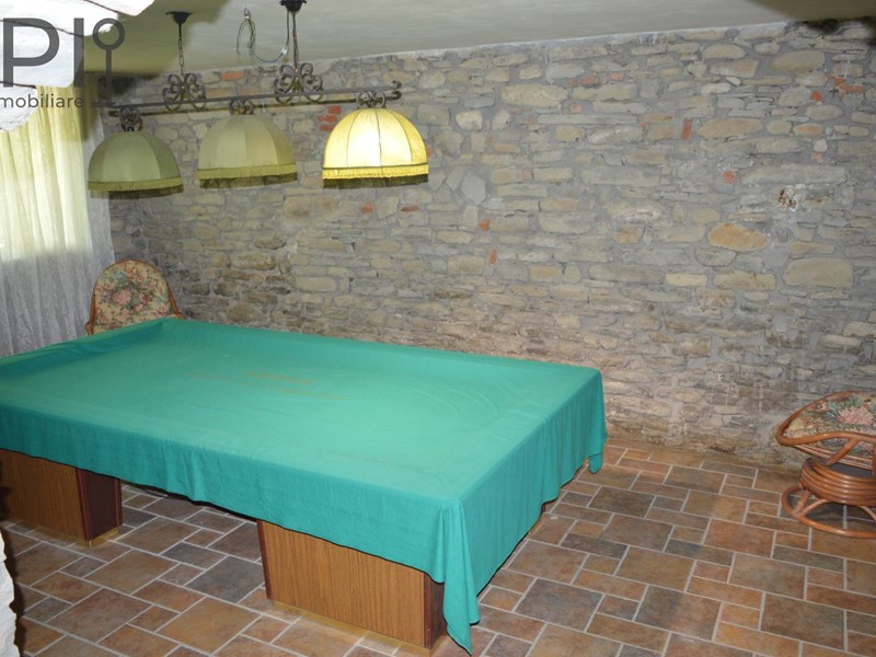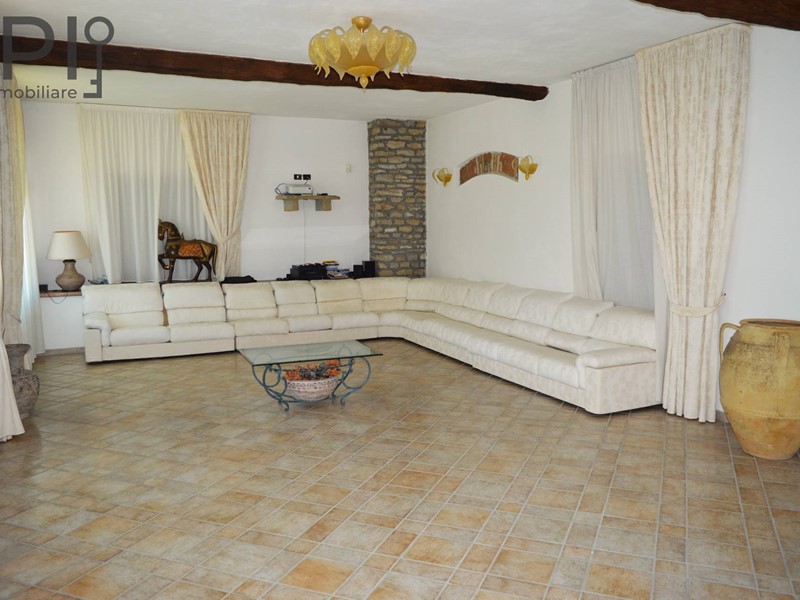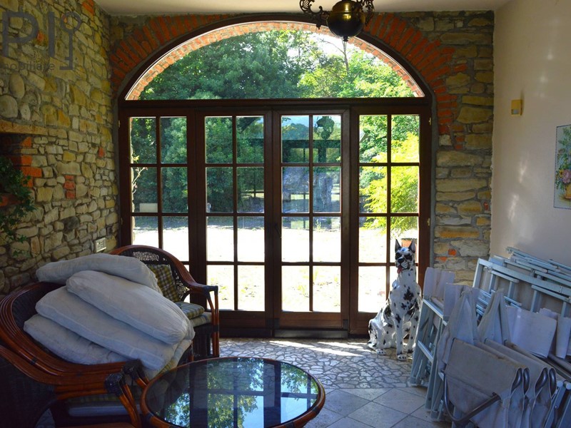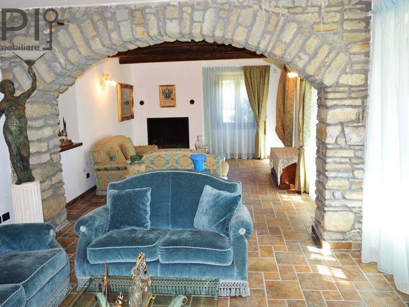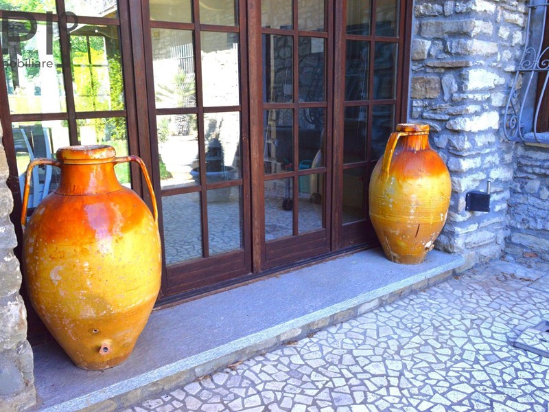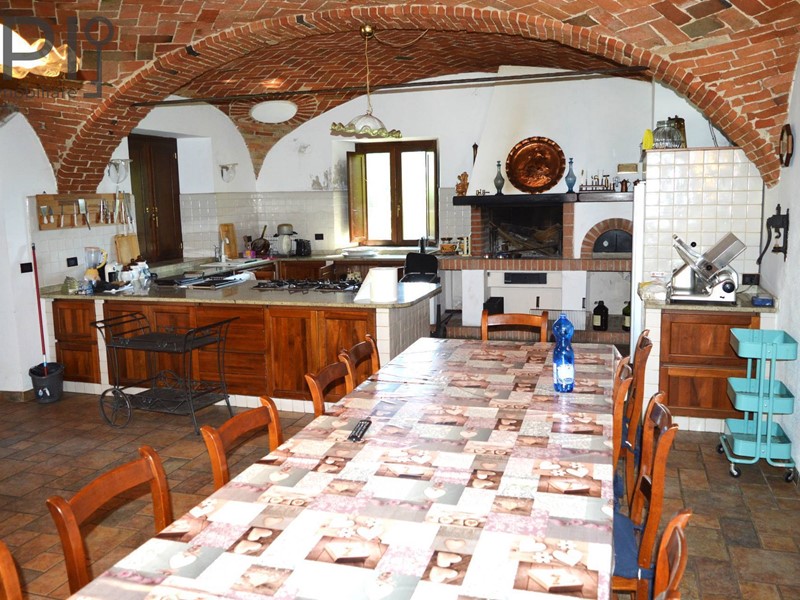 Accesso alla imponente villa da ingresso con porticato, direttamente sulla cucina in muratura con pavimenti in cotto, splendide volte in mattoni, forno e barbecue a legna e annessa sala da pranzo; da qui accesso ad una parte verandata che collega la cucina all'altra ala della casa, dove troviamo una ulteriore sala con camino e volte a crociera, sala biliardo, locale di sgombero totalmente in pietra, adibito a discoteca, e ancora sull'altro lato ulteriore salone doppio diviso da arco con camino.