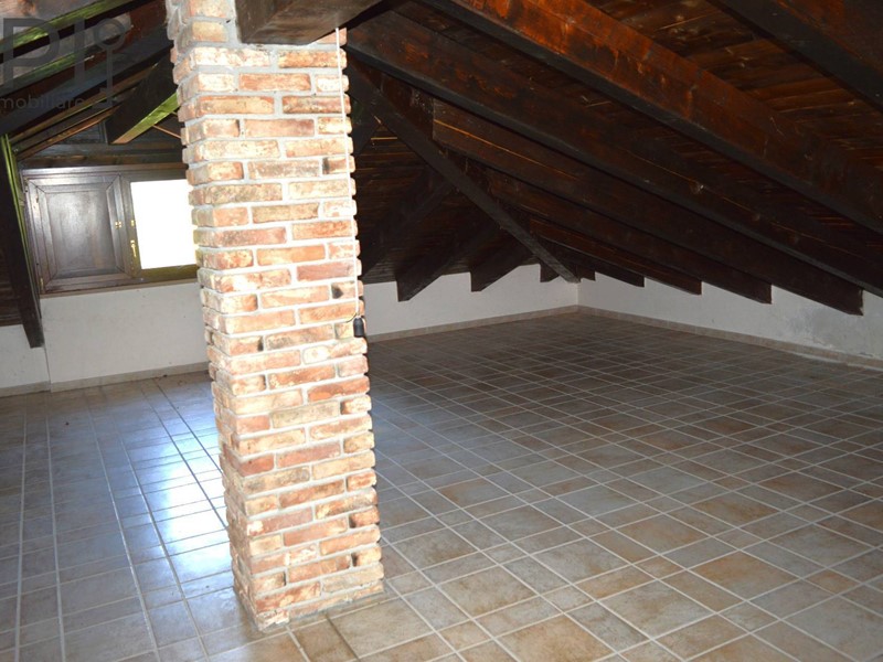 Piano mansardato con tetto a vista diviso in due parti da porte in legno e vetro serigrafato.