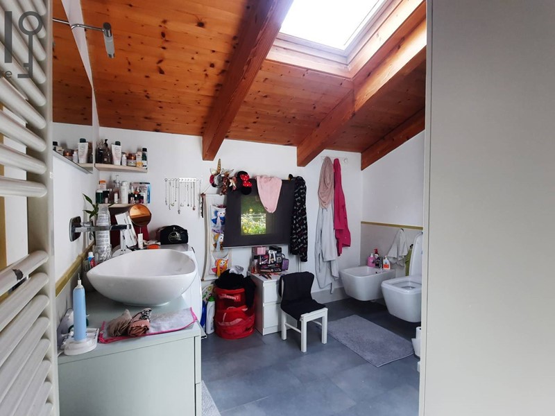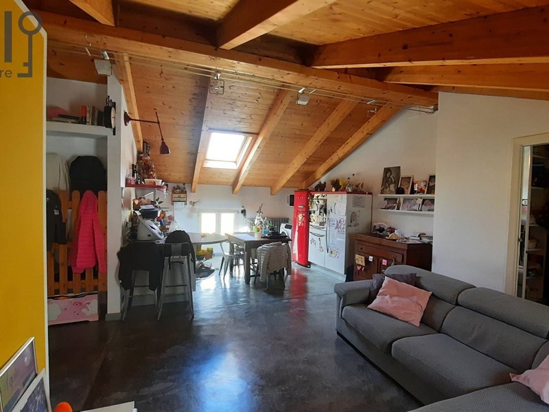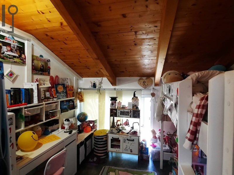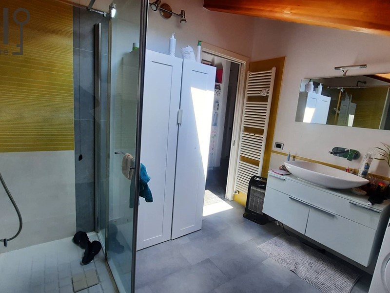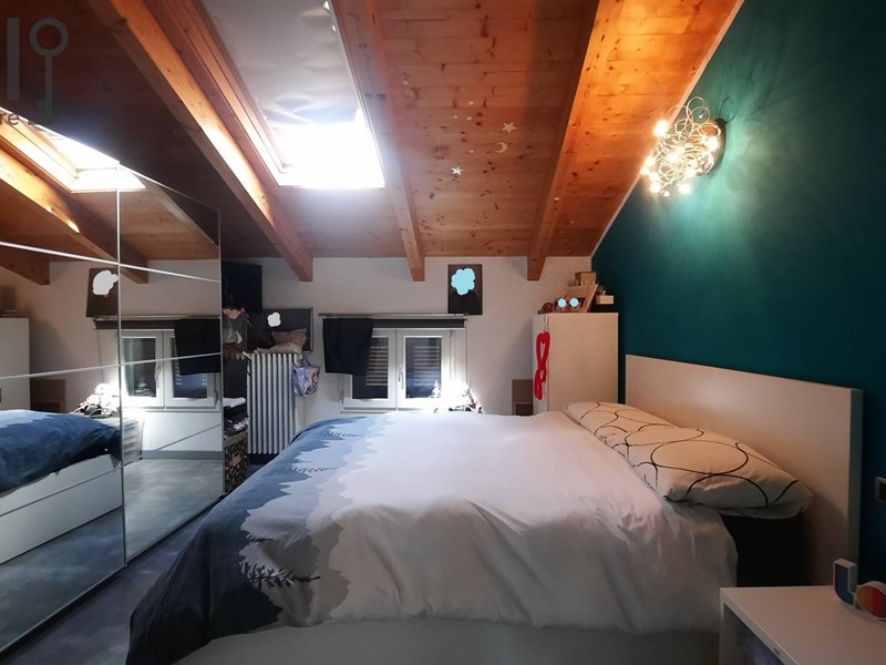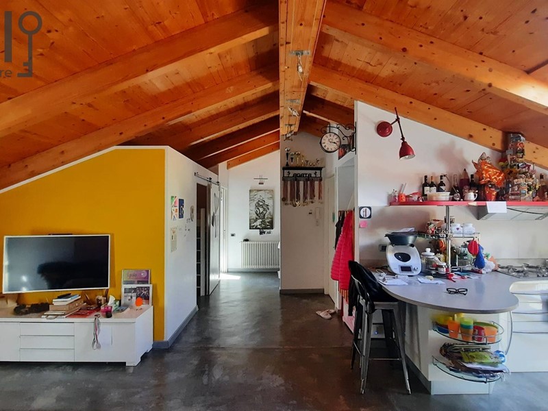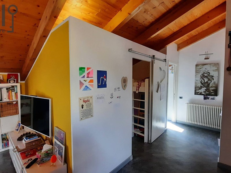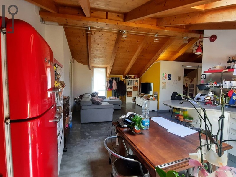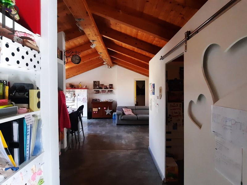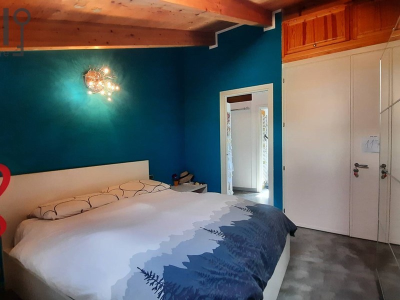 Al piano superiore altro appartamento mansardato, con tetto a vista, di taglio piu' moderno rispetto al precedente, con grande open space per zona giorno e balcone; ripostiglio, camera matrimoniale con cabina armadio, bagno spazioso con doccia over size e altro vano creato con una parete removibile. Questa parte è stata completamente rinnovata recentemente, quindi le finiture e gli impianti sono moderni, molto particolare il pavimento resinato.