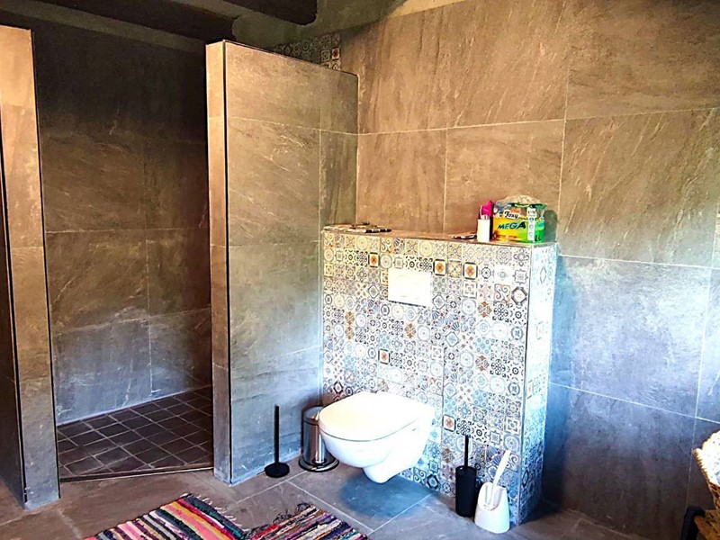 Sempre con accesso dalla terrazza ulteriore appartamento con ingresso su soggiorno/cucina, camera da letto (con uscita su fascia di terreno retrostante), un bellissimo bagno con doccia e dettagli in pietra e legno, un locale studio sfruttabile come ulteriore camera da letto.