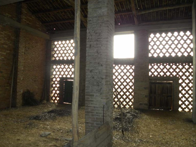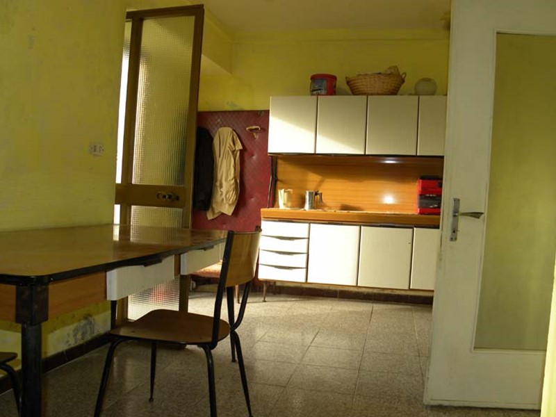 Lato cortile accesso su disimpegno che rimanda a bagno, cucina, sala, salone e porta di accesso alla vecchia stalla.