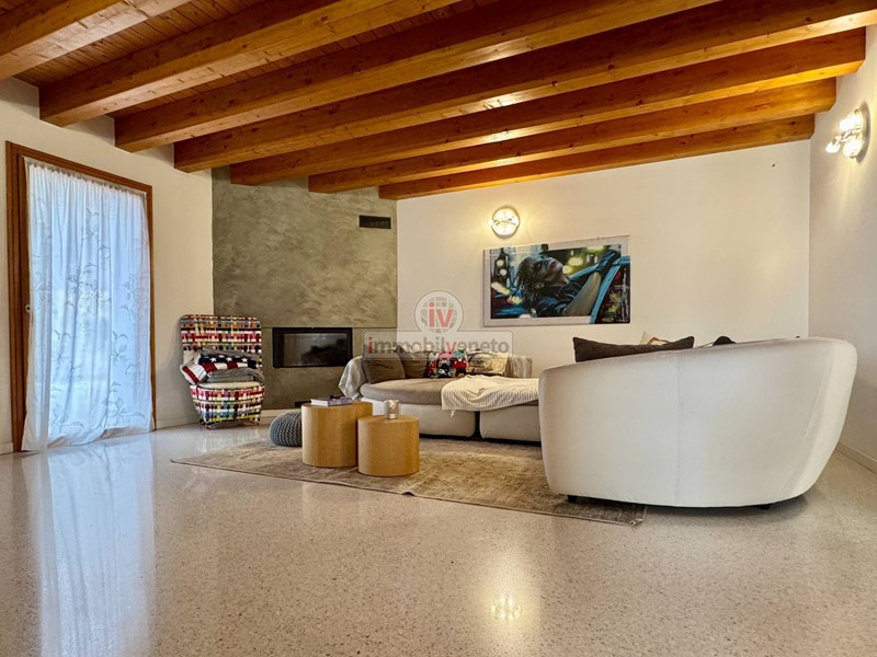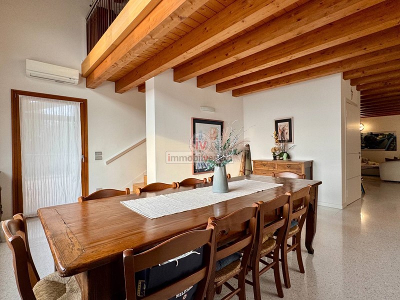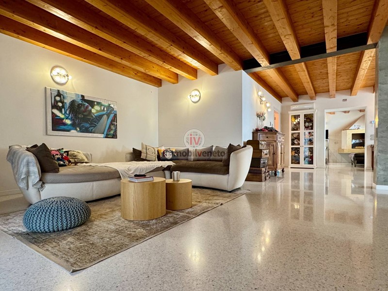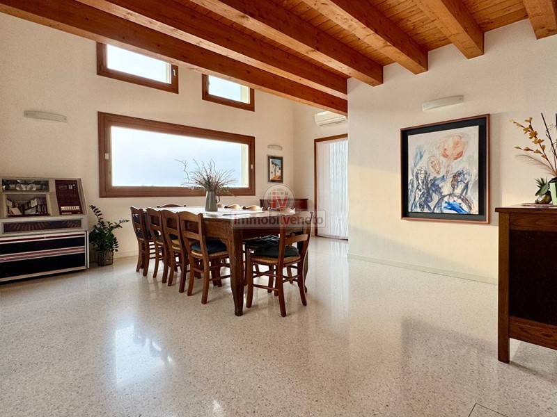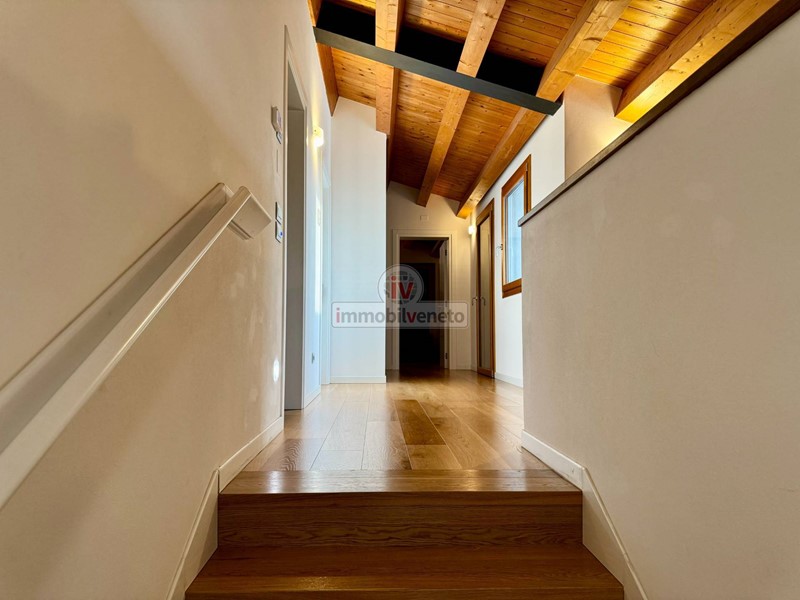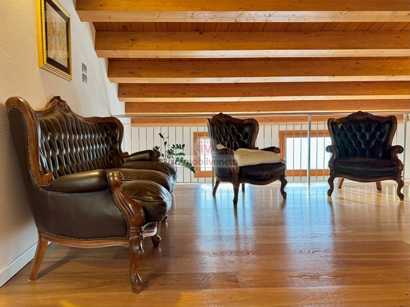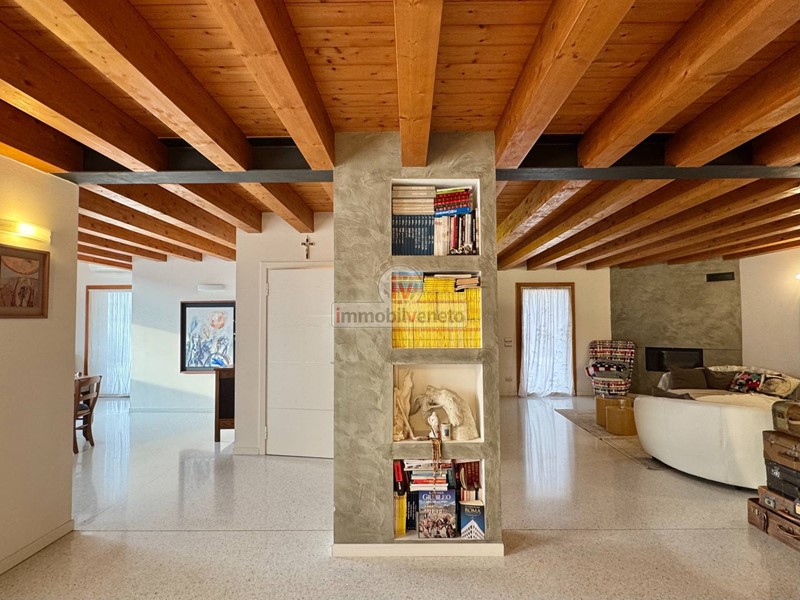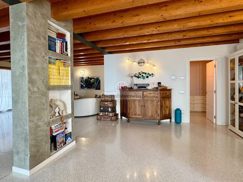 I pavimenti in veneziana nella zona giorno e in legno nella zona notte, insieme alla travatura a vista, conferiscono un tocco di classe e calore a ogni ambiente.