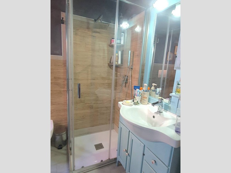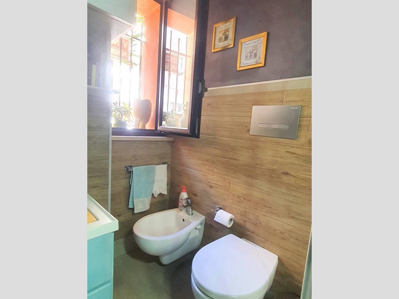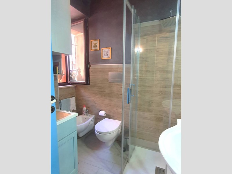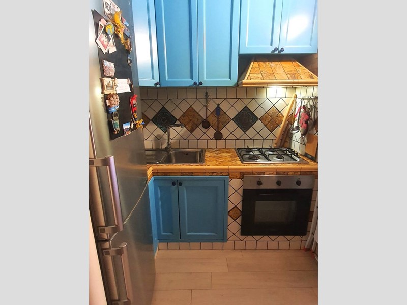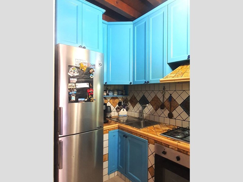 Allo stesso livello, si trova un comodo cucinotto attrezzato, un disimpegno e un bagno moderno con doccia.