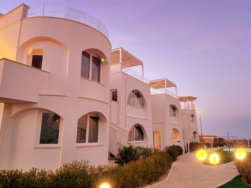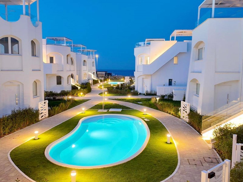 Appartamento prima fila fronte mare per civile abitazione sito al piano terreno, delle dimensioni di 78 m² circa, composto da ingresso su salone soggiorno con angolo cottura, sala da pranzo circolare a vetrata, due camere da letto (Di cui una matrimoniale ed un'ampia doppia), bagno con doccia e finestra, corridoio nel reparto notte. L'appartamento è inoltre fornito di un giardino privato delle dimensioni di 177 m² circa, completamente recintato.