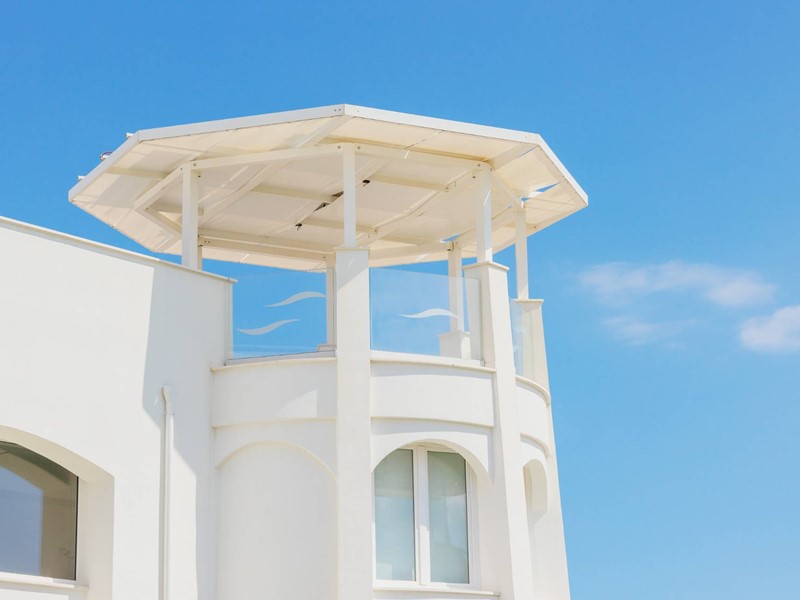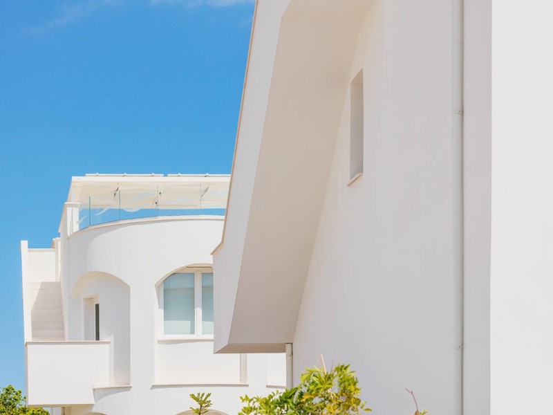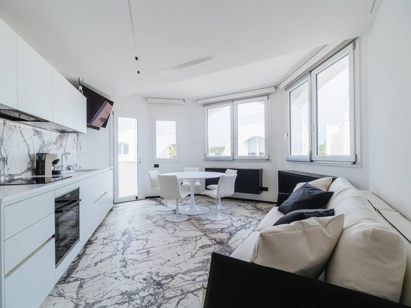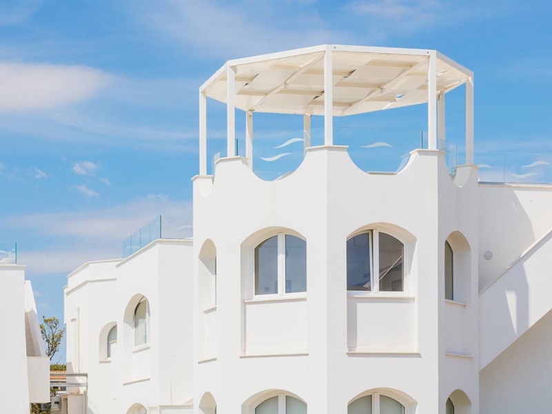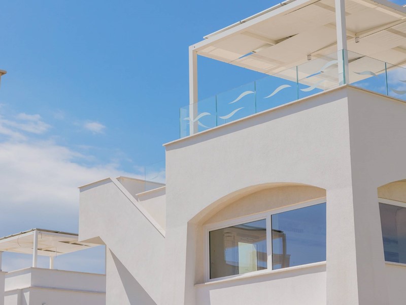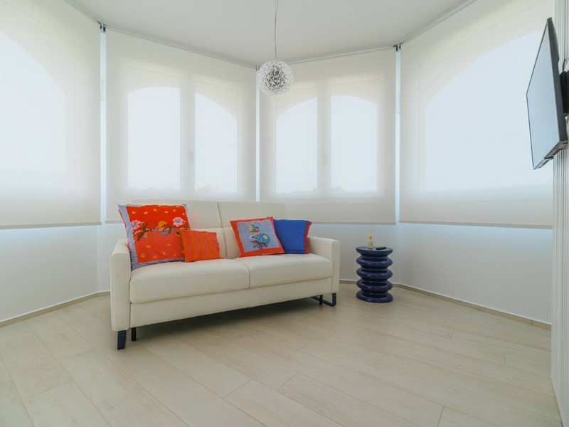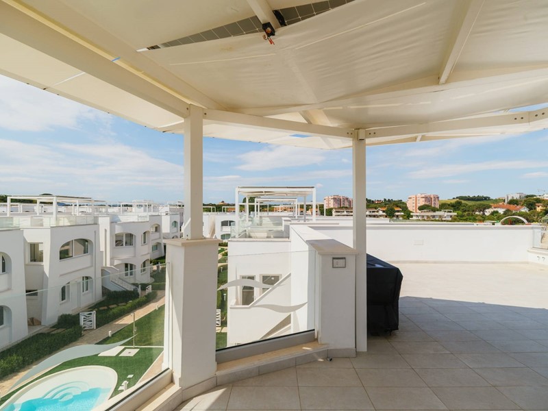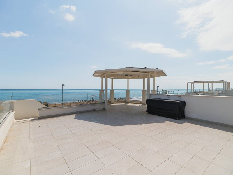 Piano secondo con meravigliosa terrazza solarium privata al piano superiore delle dimensioni di 78 mq circa, con vista del mare, allestita con cucina all'aperto e gazebo ombreggiante.