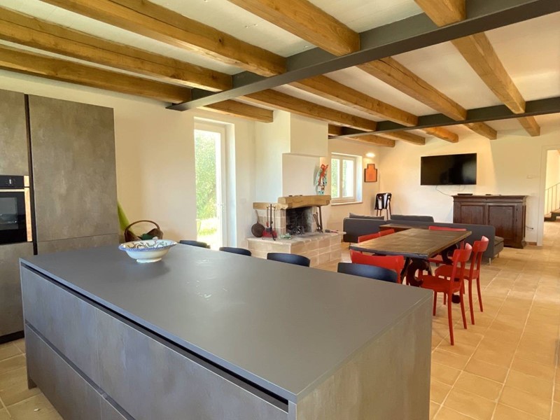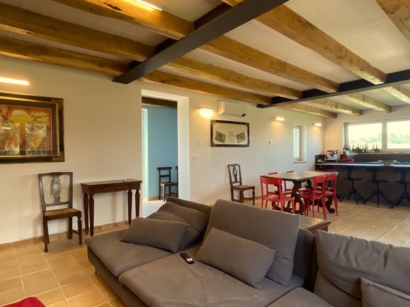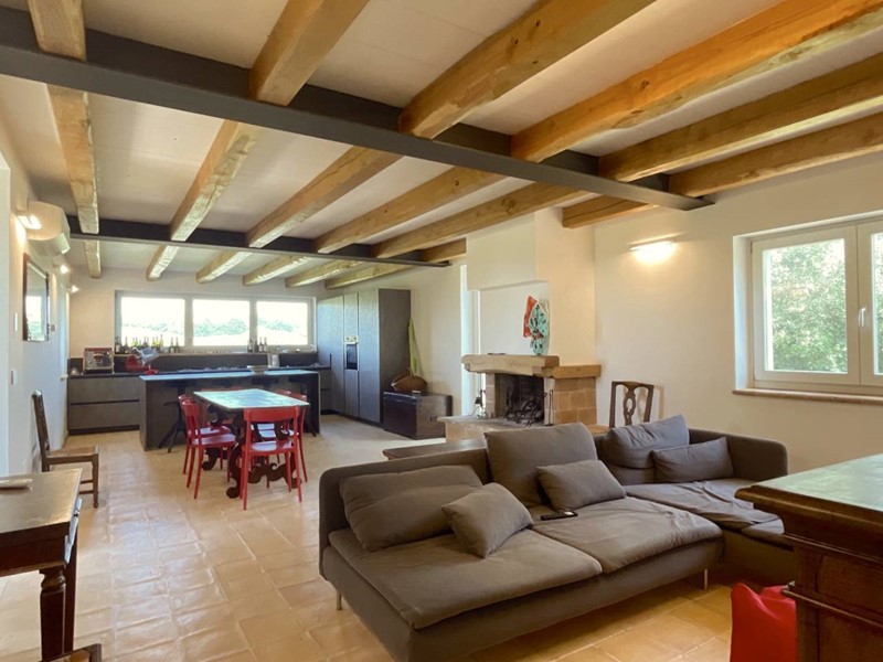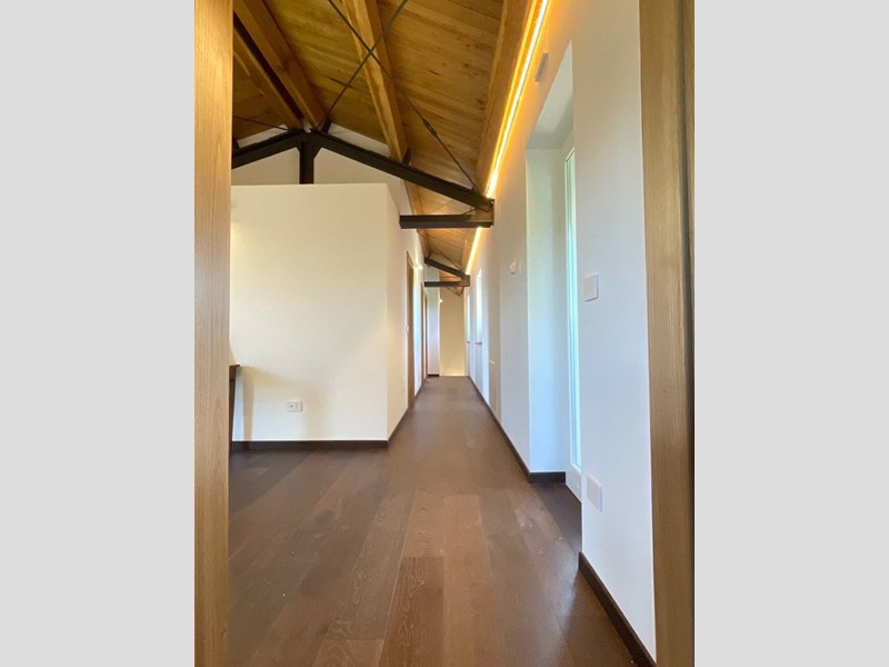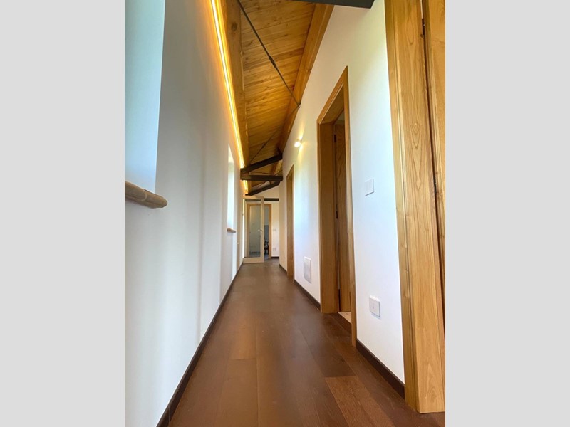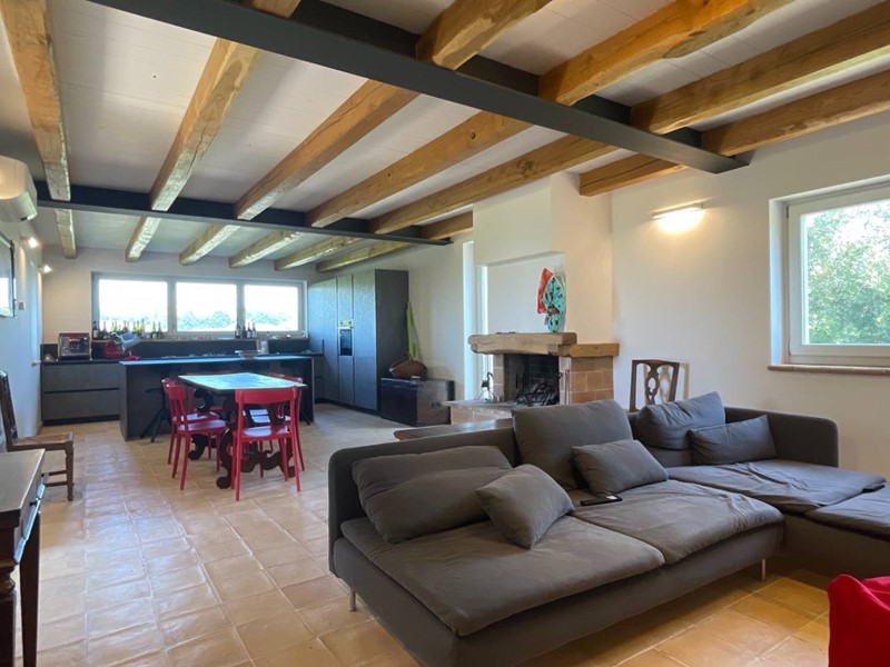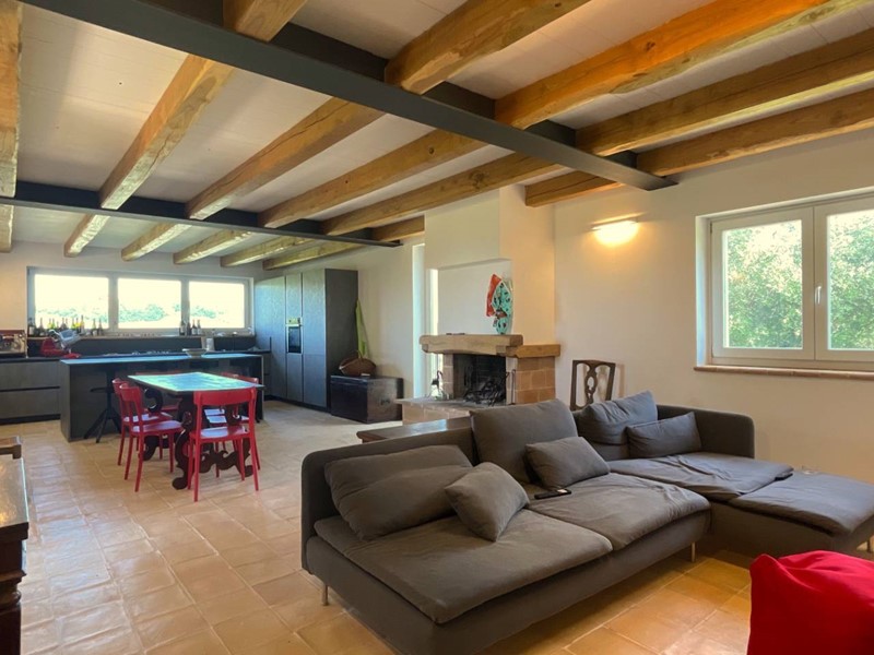 Struttura portante in acciaio e legno di castagno, soffitti con travi a vista, impianto di riscaldamento a pavimento, clima in ogni ambiente, pavimentazione in cotto fatto a mano nella zona giorno e parquet nel reparto notte, porte in legno massello, infissi in legno provvisti di vetri termici e scuri in legno.
