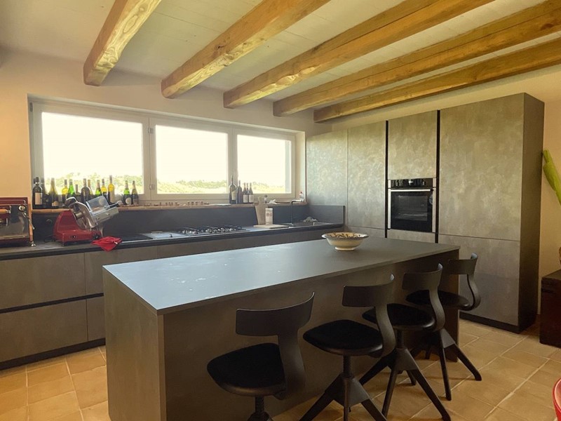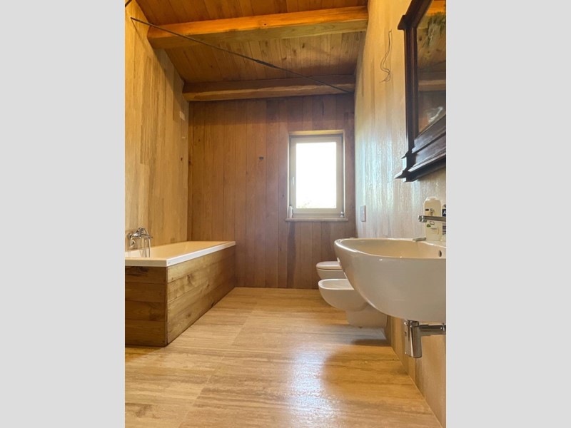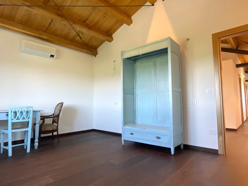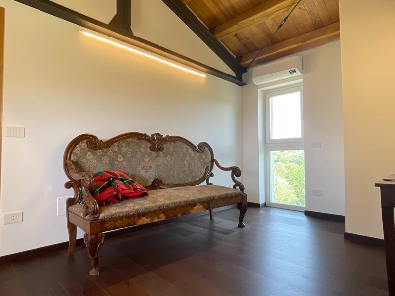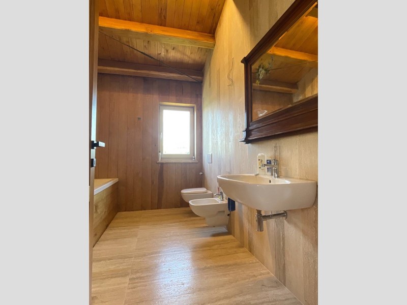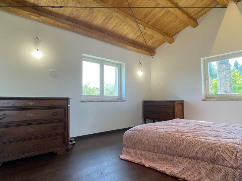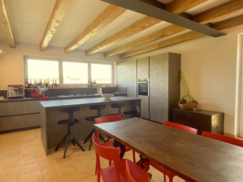 Struttura portante in acciaio e legno di castagno, soffitti con travi a vista, impianto di riscaldamento a pavimento, clima in ogni ambiente, pavimentazione in cotto fatto a mano nella zona giorno e parquet nel reparto notte, porte in legno massello, infissi in legno provvisti di vetri termici e scuri in legno.