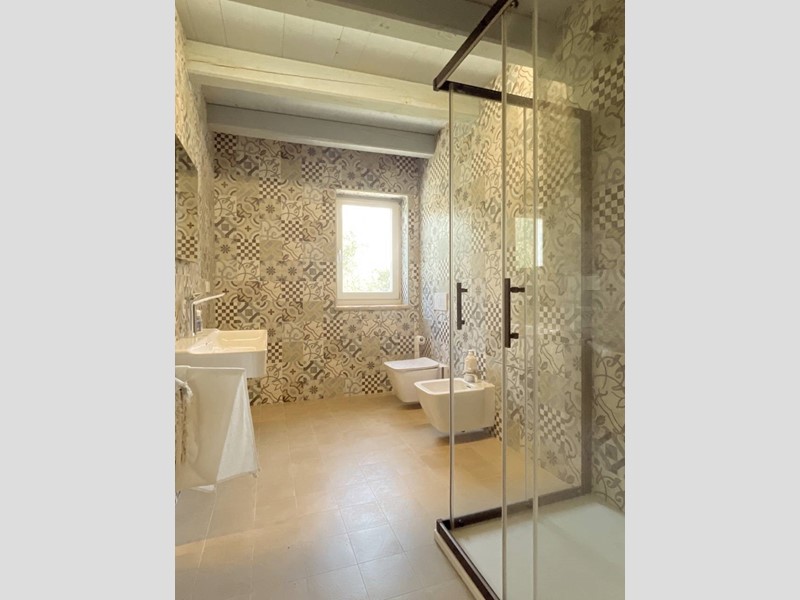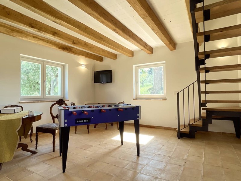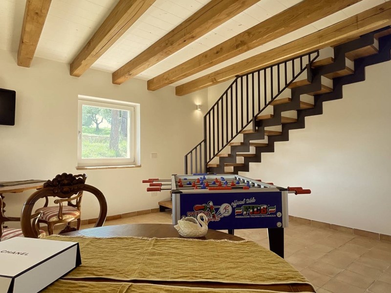 Completa la proprietà un terreno agricolo circostante di circa 7 ettari, su cui sono presenti una piscina (allo stato grezzo avanzato) dimensioni mt. 10 x 5 con fossa per i tuffi, un annesso di circa 20 mq. adibito a spogliatoio/bagno, oltre 100 piante di ulivo, piccolo vigneto e la restante porzione coltivato a seminativo.