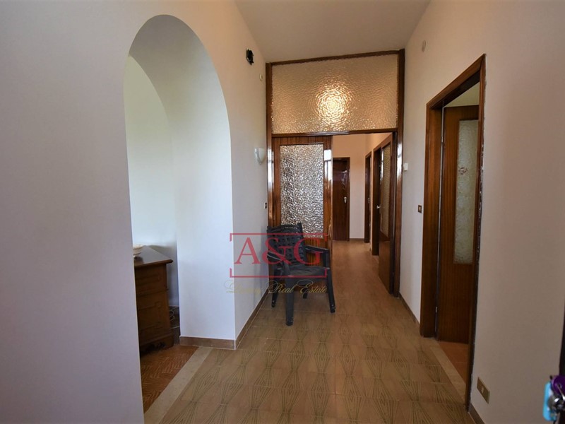 Piano primo (130 mq): Accessibile tramite scala esterna, con ingresso, soggiorno, cucina, corridoio, due camerette, due camere matrimoniali, un bagno e due ampi balconi di circa 50 mq. L'appartamento è dotato di doppie finestre.