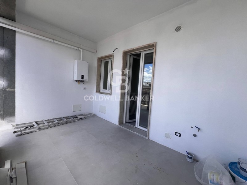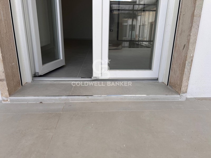 All'interno, l'appartamento è composto da tre locali, tra cui un living con angolo cucina a vista, una camera da letto ed un bagno completo di tutti i servizi; Inoltre attraverso una portafinestra in proseguimento della pavimentazione del living trova spazio una veranda abitabile in cui sono stati riportati tutti gli attacchi della zona cucina.