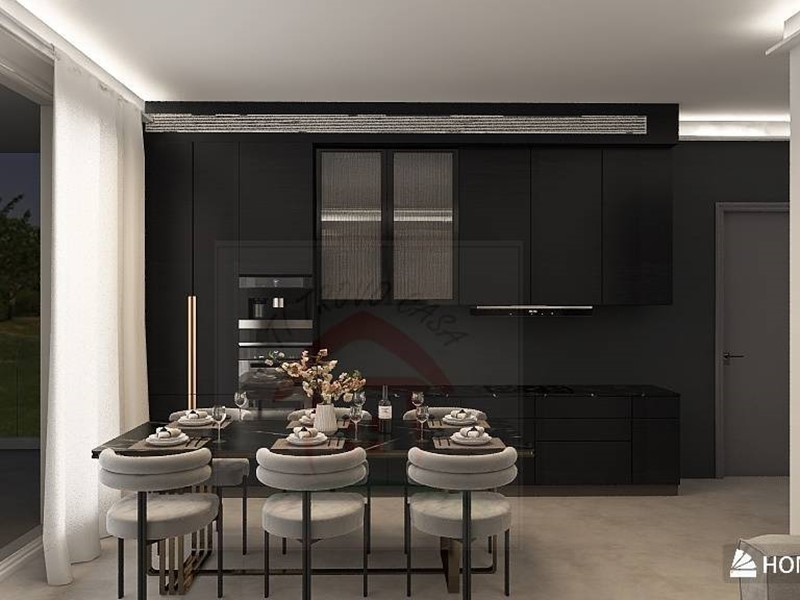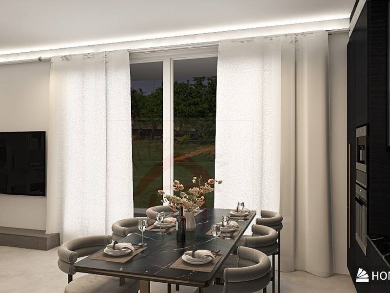 Zona living ampia e luminosa con cucina a vista, impreziosita da una grande vetrata scorrevole che dà accesso al terrazzo e a un giardino esclusivo di circa 180 mq: perfetto per rilassarsi, far giocare i bambini o organizzare cene allaperto.