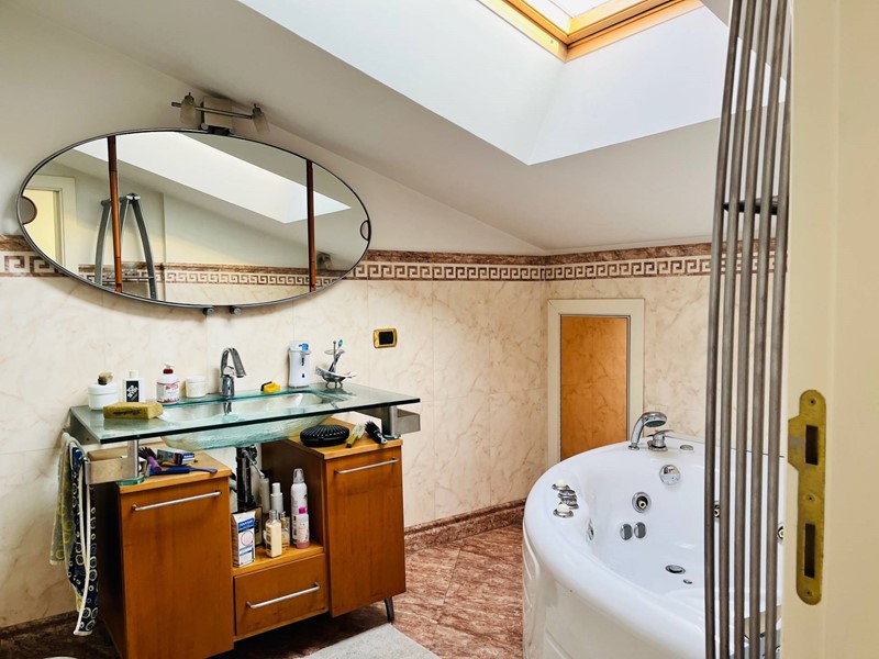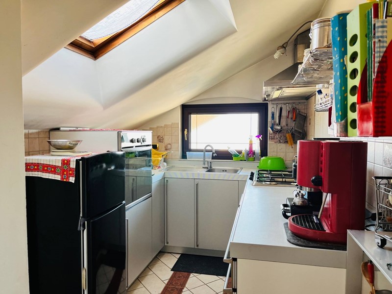 L'appartamento al TERZO PIANO si compone di: un soggiorno-pranzo con camino e forno per la pizza, un cucinino, un ripostiglio, due camere matrimoniali, un bagno e due terrazzi a tasca, sul tetto, molto riservati e comodi (totale superficie 95mq). Le finestre a tetto sono con serrande elettriche. Il tutto è completato da un GARAGE di 18mq e una CANTINA di 19mq, di proprietà esclusiva.