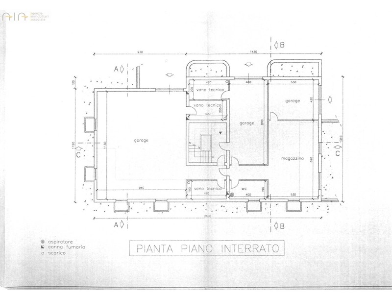 - Piano seminterrato della superficie di mq 302 circa, destinato a locali garage e servizi vari, in parte finestrati;