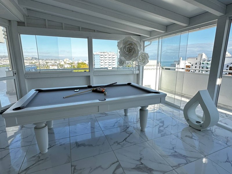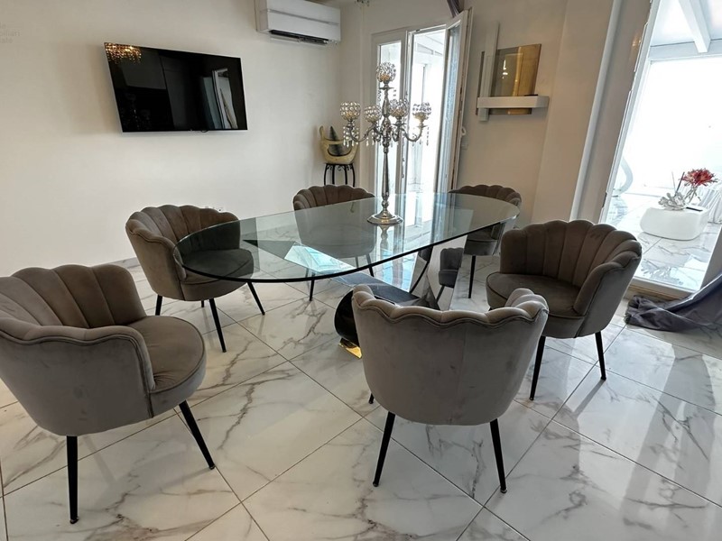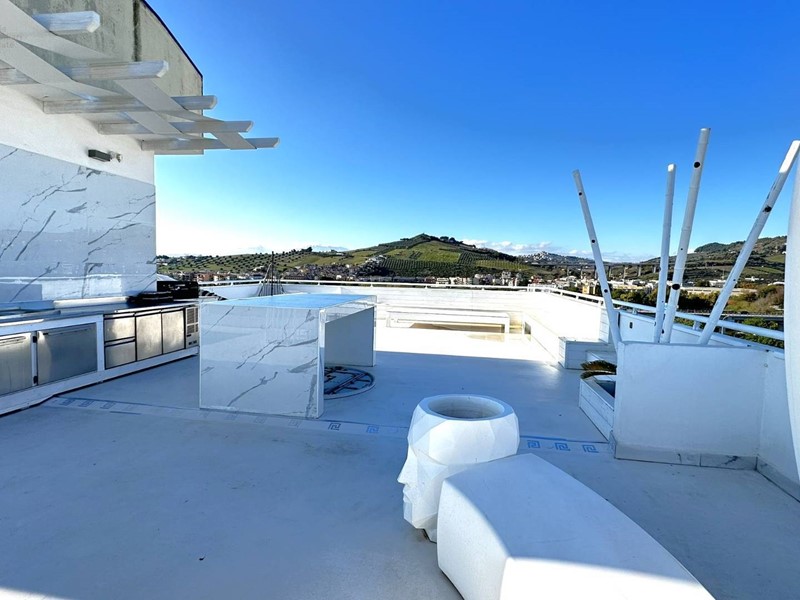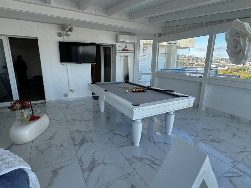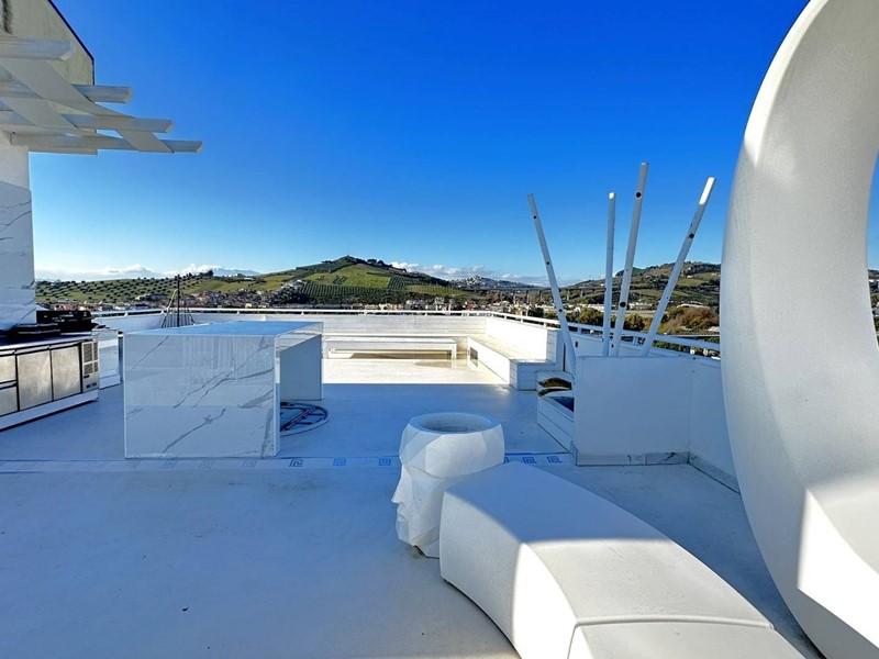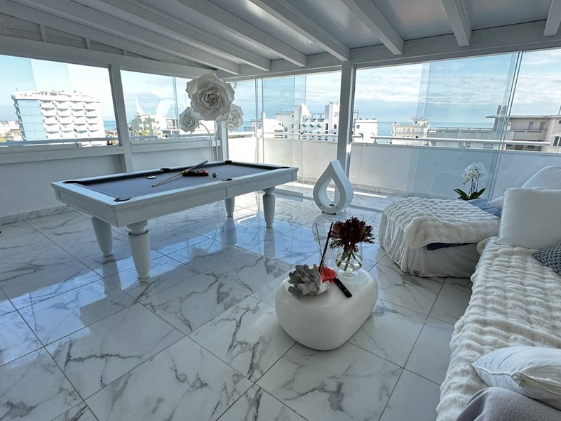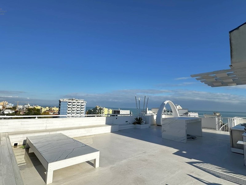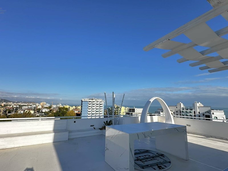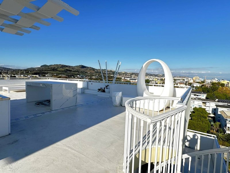 Attico con superattico posto al piano settimo ed ottavo di circa 130 mq interni con fantastiche terrazze panoramiche vista mare e colline di oltre 270 mq a soli 100 mt dal lungomare. L'alloggio oggetto di una ristrutturazione totale con materiali di qualità è così suddiviso: al piano settimo troviamo un soggiorno con angolo cottura, gazebo esterno con vetrate e zona salotto, corridoio, quattro camere, e due bagni e panoramici terrazzi perimetrali, con vista mare, colline e montagne, per circa 130 mq; al piano superiore ottavo, accessibile con una scala esterna, troviamo un ampio locale multi uso ed uno splendido terrazzo di oltre 140 mq, esposto su tutti i lati, attrezzato con una bellissima cucina esterna, tavoli in marmo, diverse zone di confort e relax con una splendida vista sul mare e sul paesaggio circostante.