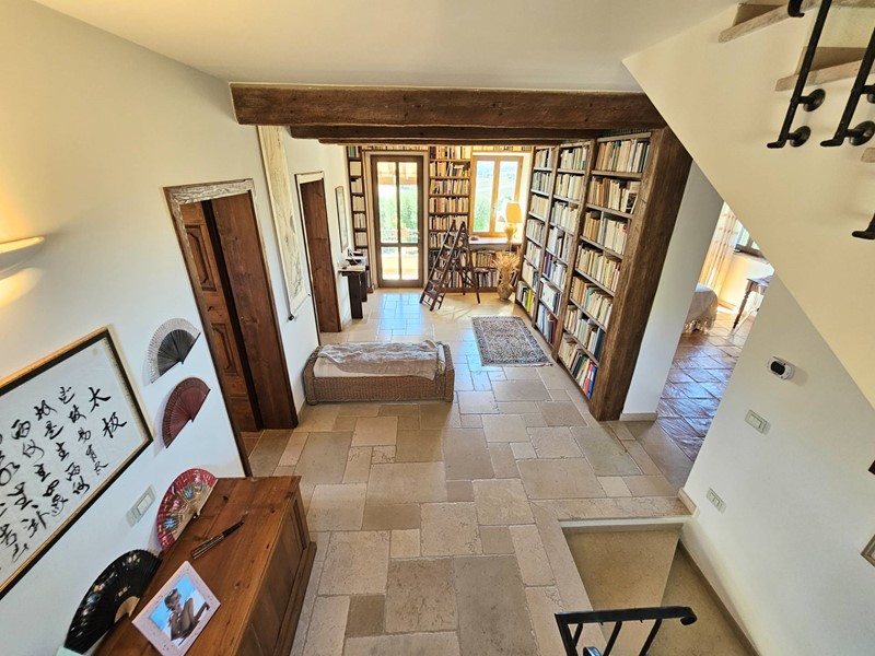 Mediante scala interna ed esterna è possibile raggiungere il piano primo dove sarete accolti da un meraviglioso ed elegante ingresso fornito anch'esso di bellissime librerie in legno su misura.