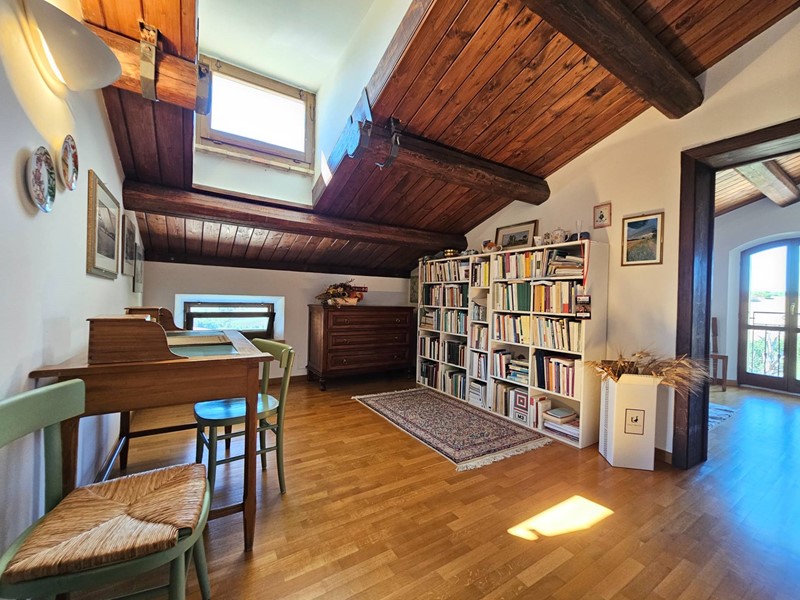 Il casale si sviluppa su tre piani per complessivi mq 290 circa così composto; il piano terra dispone di ampio ed elegante ingresso, soggiorno con camino adornato da suggestive librerie in legno, sala da pranzo, cucina, dispensa, bagno, camera da letto e ampio deposito convertibile in ulteriore camera/monolocale indipendente.