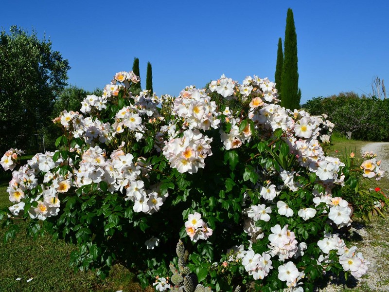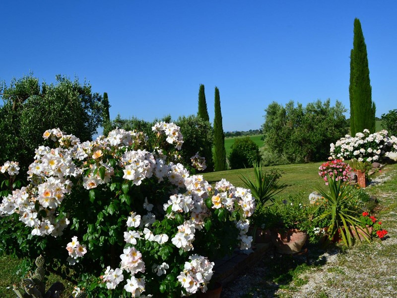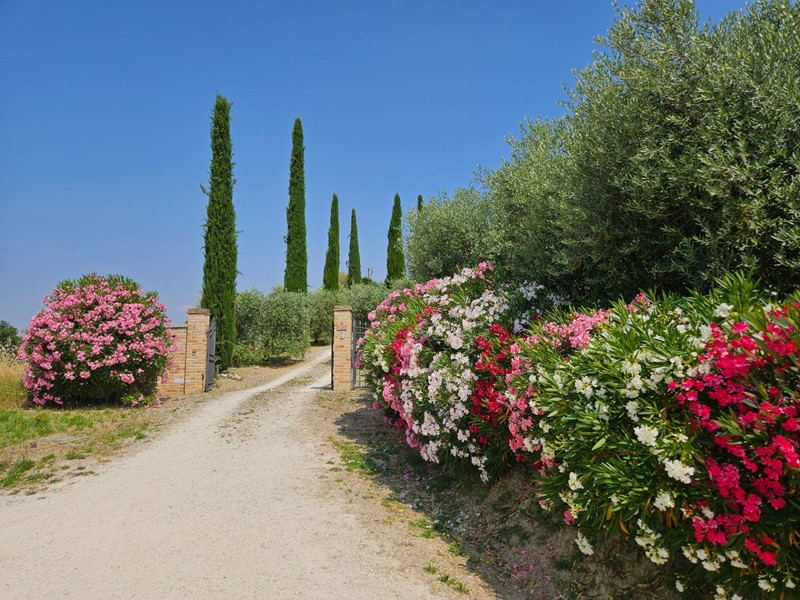 Un elegante ingresso con cancello in ferro battuto, conduce ad un viale alberato con grandi cipressi che si apre alla vista del casale e del suo meraviglioso giardino.