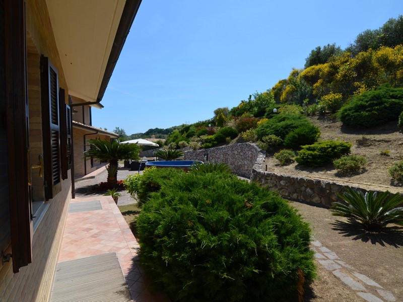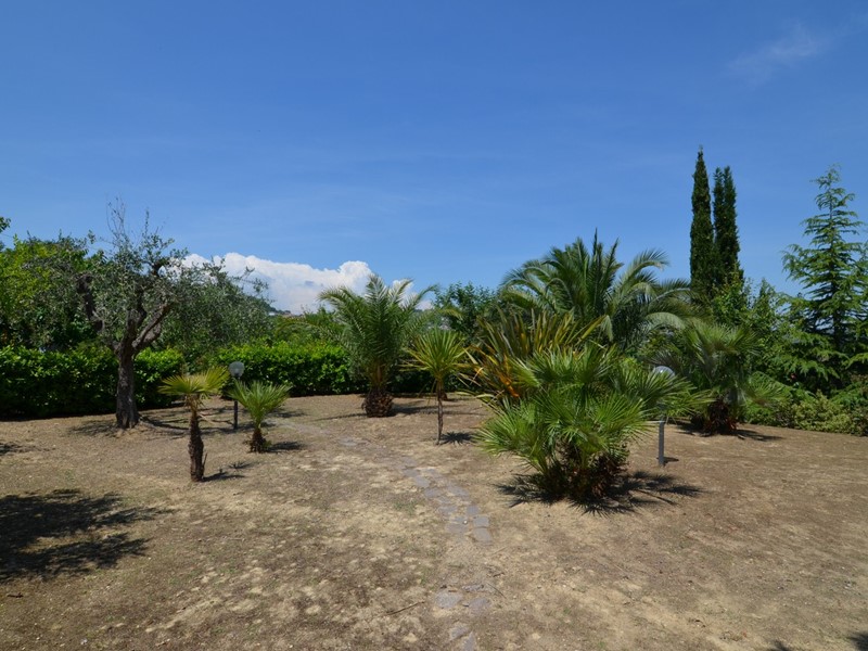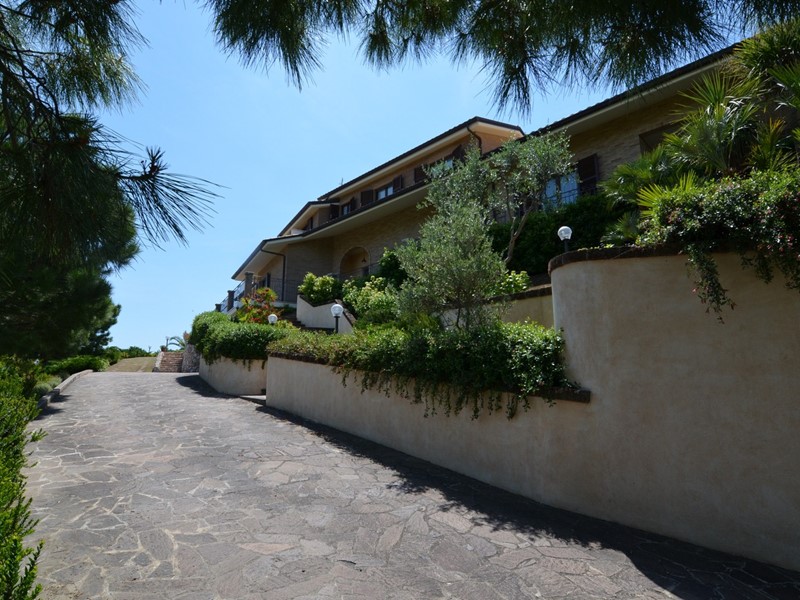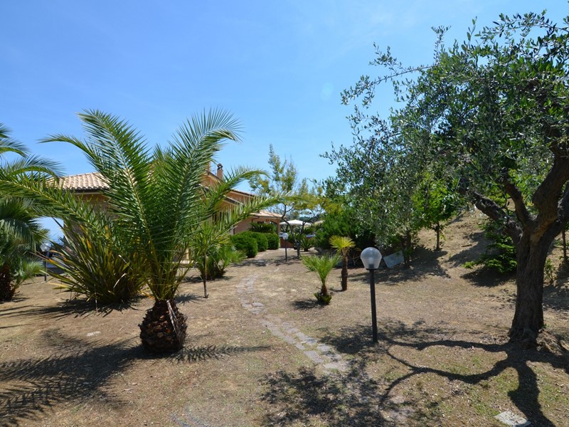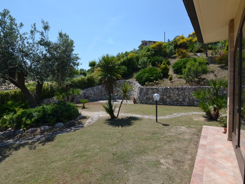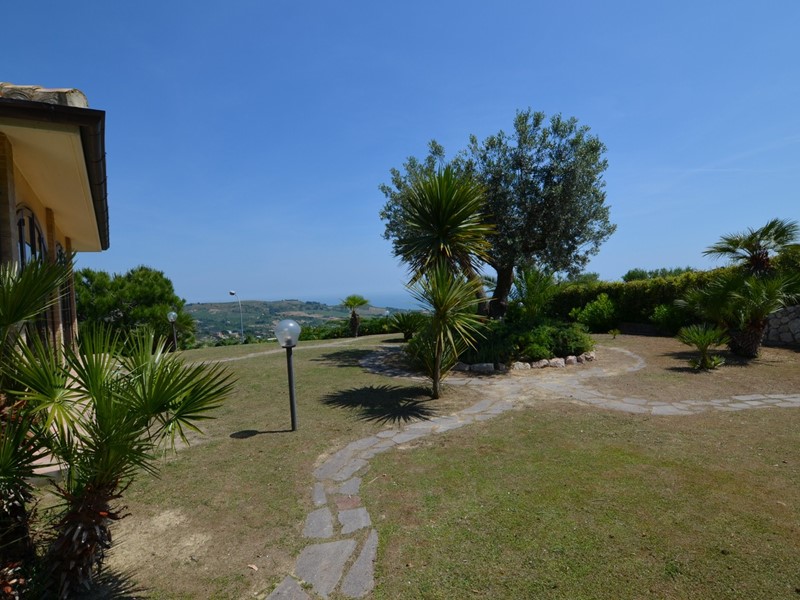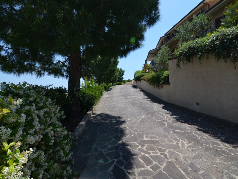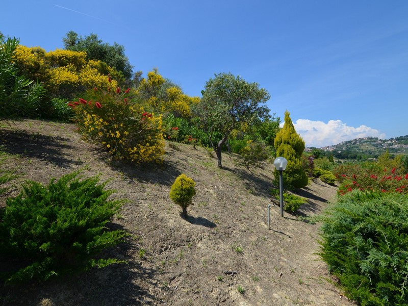 L'esterno della residenza, é costituito da un ampio giardino, di oltre 2.100 mq circa, allestita con un giardino mediterraneo, con piante ed essenze di varie specie, come ulivi, cespugli fioriti, zona di prato all'inglese, il tutto raggiungibile con una suggestiva camminata su un percorso di vialetto interno. L'ingresso alla residenza é stato realizzato con un comodo viale di ingresso, completamente pavimentato. Da ogni angolo della residenza é possibile godere di una stupefacente vista del mare, della costa e della collina, oltre che dell'intera lottizzazione di ville esclusive in cui é posta la casa stessa. Questa abitazione é la residenza ideale per chi é alla ricerca di esclusività, massima indipendenza e piena riservatezza a due passi dalla città.