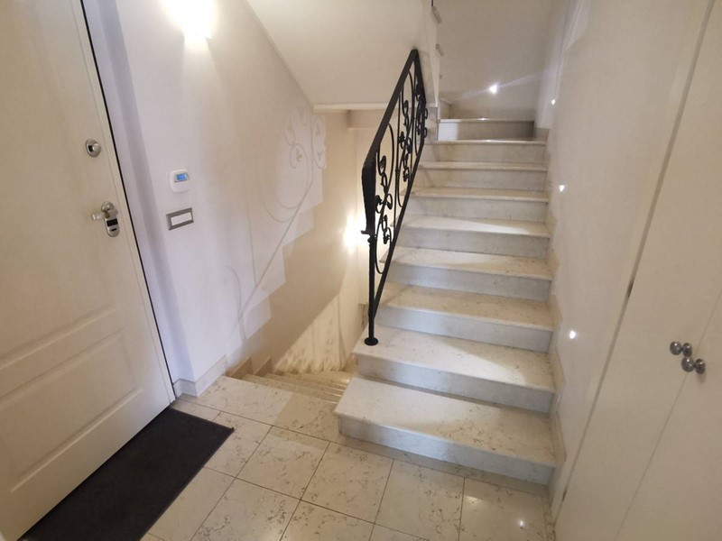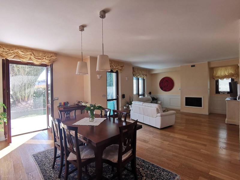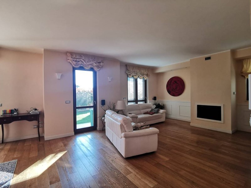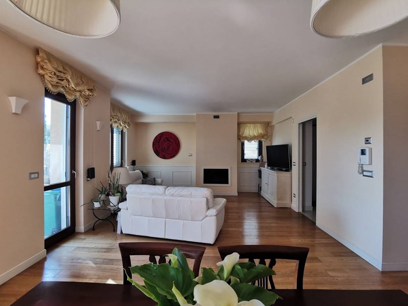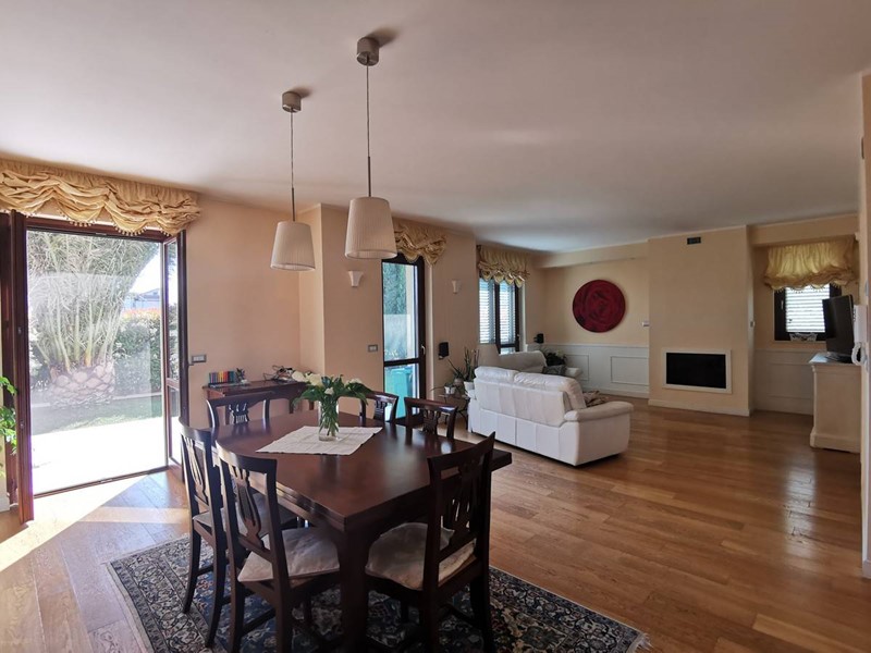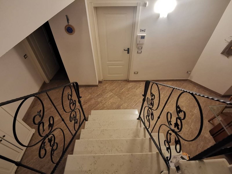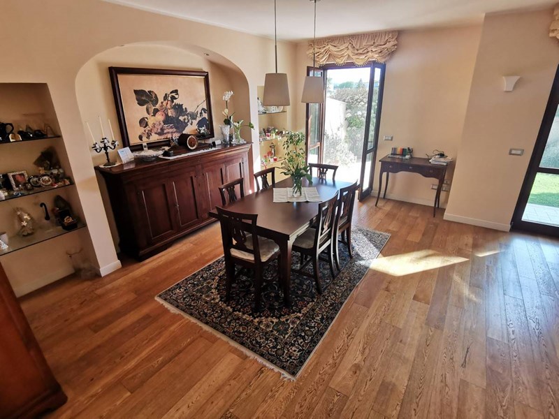 Proponiamo in vendita Villetta a schiera di testa in trifamiliare ricadente nel comune di Monte Urano a 2 minuti dal centro commerciale Oasi e 5 Minuti da Fermo.Il complesso residenziale è di recentissima costruzione,realizzato con materiali performanti per quanto riguarda l' isolamento termoacustico e di ricercatissima qualità per quanto riguarda le scelte adottate nei rivestimenti.I pavimenti sono tutti realizzati in listoni grandi di parquet prefinito che per la scelta effettuata rendono molto semplice arredare la casa sia per un gusto moderno o classico che sia.I bagni sono stati rifiniti con materiali pregiati e le pitture rendono neutri e rilassanti tutti gli ambienti.La localizzazione è ottima per chi ama la campagna ma vuole i servizi in poche centinaia di metri.L'unità immobiliare proposta in vendita è stata pensata fin dal primo momento con lungimiranza è infatti predisposta come 2 unità immobiliari ma divisa come una vera e propria villetta.Al piano strada appena si arriva sono disponibili 2 posti auto di proprietà molto comodi,dal cancelletto si entra nella proprietà privata e sin da subito notiamo l' elevata eleganza dell' immobile con un curatissimo giardino che gira su 3 lati.Entrando in casa ci troviamo in uno spazioso pianerottolo che collega la parte seminterrata ai livelli superiori,continuando sullo stesso livello si accede ad un luminoso e spazioso soggiorno arredato da grandi divani e da un accogliente camino a legna,la parte più riservata è adibita a sala da pranzo,separata troviamo anche una ben attrezzata cucina abitabile, un bagno completo e zona ripostiglio.Scendendo dalla scala si arriva in un grandissimo locale diviso in varie zone ed utilizzato in parte come taverna/studio,bagno/lavanderia, ed in parte cpme svariati posti auto e cantine.Risalendo dalla scala e arrivando al piano primo troviamo il reparto notte ripartito in 3 camere doppie di cui 2 con cabina armadio, una stanza studio e 2 bagni.Il piano è servito anche da terrazzi che sono accedibili dalle stanze da letto.In ultimo parte del tetto è stata realizzata ed attrezzata come terrazzo solarium.