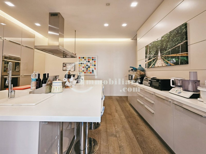 sul lato destro del corridoio centrale dingresso troviamo il salone doppio, sala da pranzo, sala TV - o stanza ospiti - con parete mobile modulare, unampia cucina allamericana con isola centrale, zona servizi e lavanderia, balcone e la grande terrazza a livello con zona barbecue e salotto.