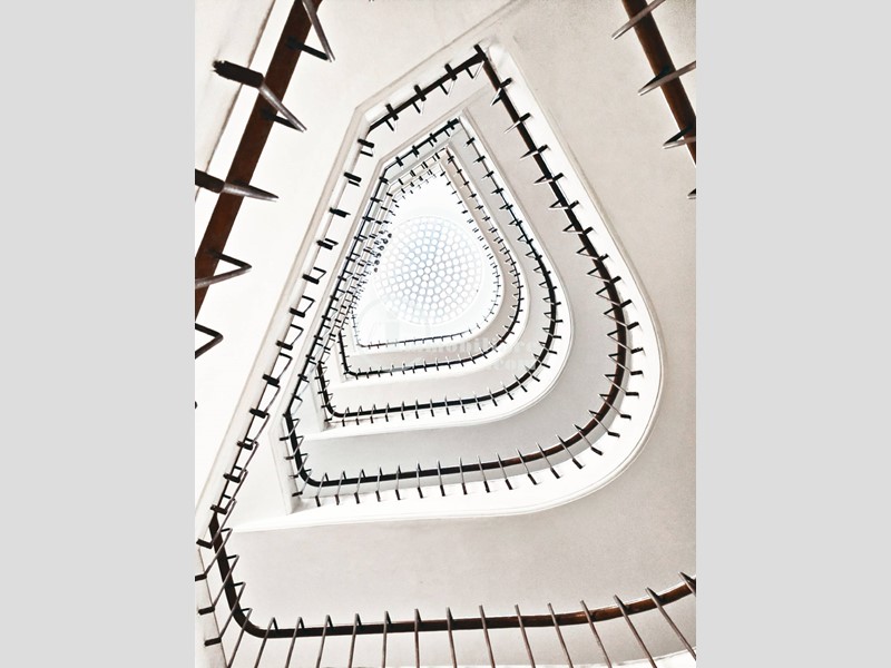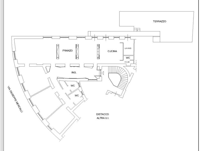 La pianta della casa segue il curvo perimetro circolare/angolare dello stabile con una tripla esposizione Nord/Ovest/Est:
