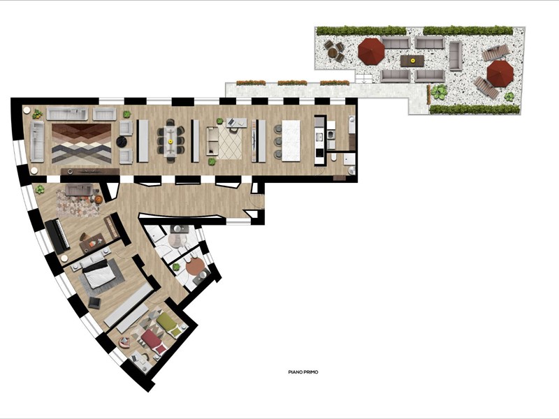 N.B. all'interno dell'annuncio sono presenti alcuni rendering della sola terrazza a fronte di un progetto di rimodernamento dello spazio esterno