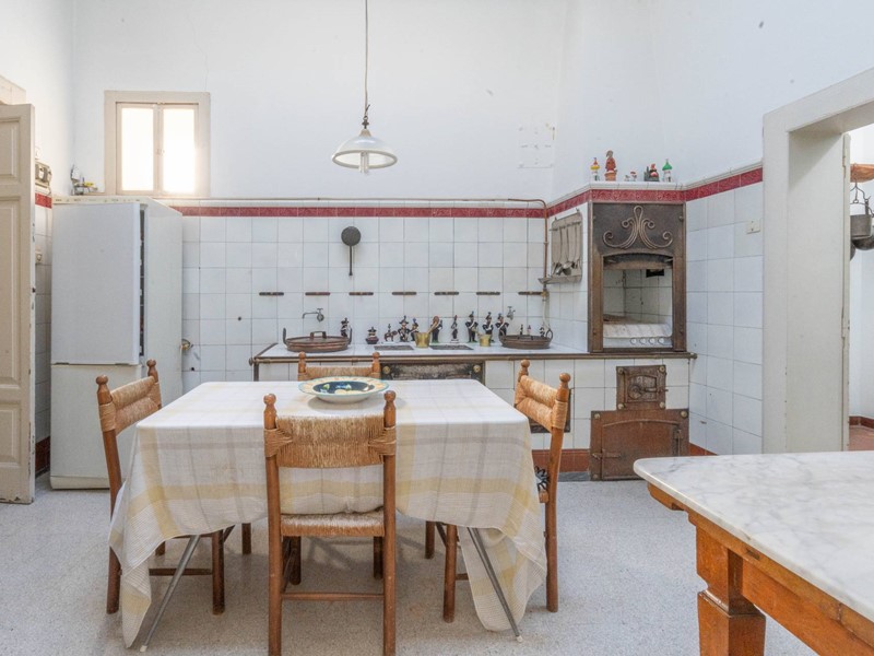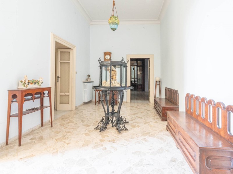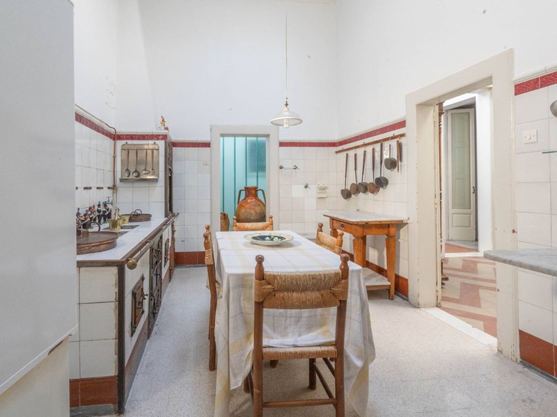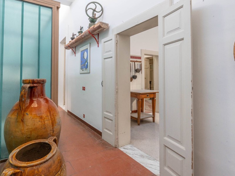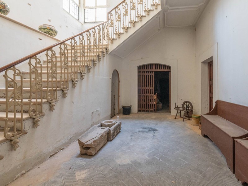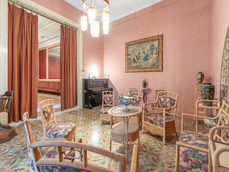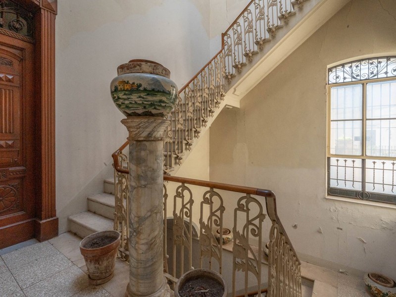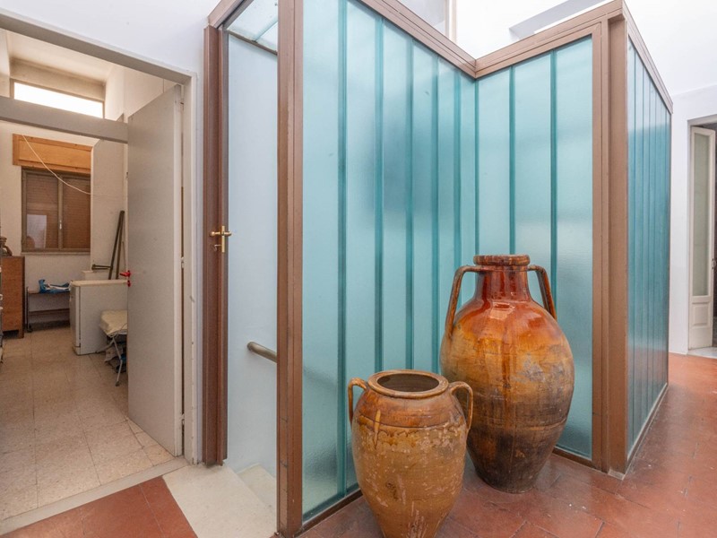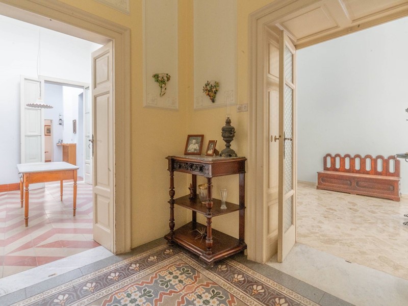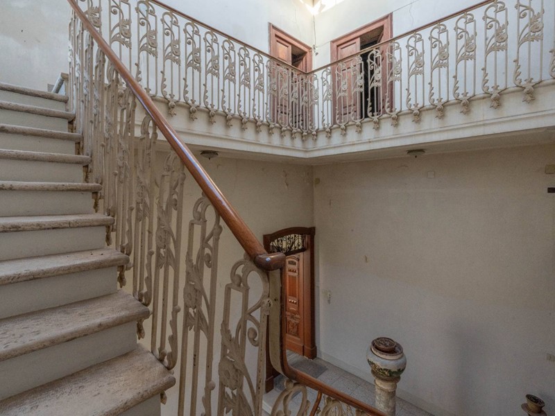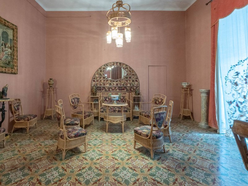 Particolarmente eleganti gli ambienti al piano primo (raggiungibili da una importante scalinata rivestita in pietra che comunica tutti i livelli del palazzo) caratterizzati da disegni geometrici e colorate cementine antiche che ricoprono tutte le stanze, oltre ad una antica cucina realizzata in muratura e rivestita in rame ed un bellissimo camino in pietra. Sono ben 350 circa i metri quadrati di questo piano del palazzo, suddivisi in 16 vani oltre accessori, oltre ad una generosa terrazza che si affaccia sulla rinomata Piazza Umberto I.