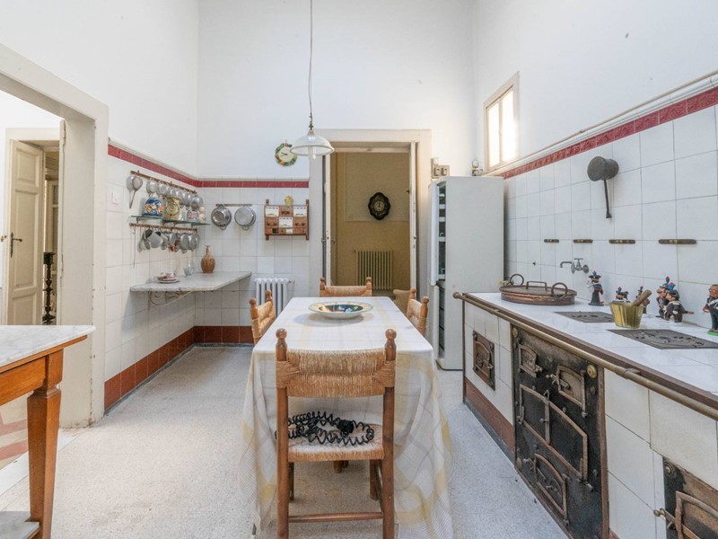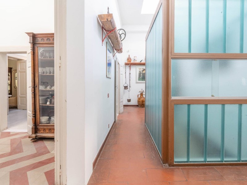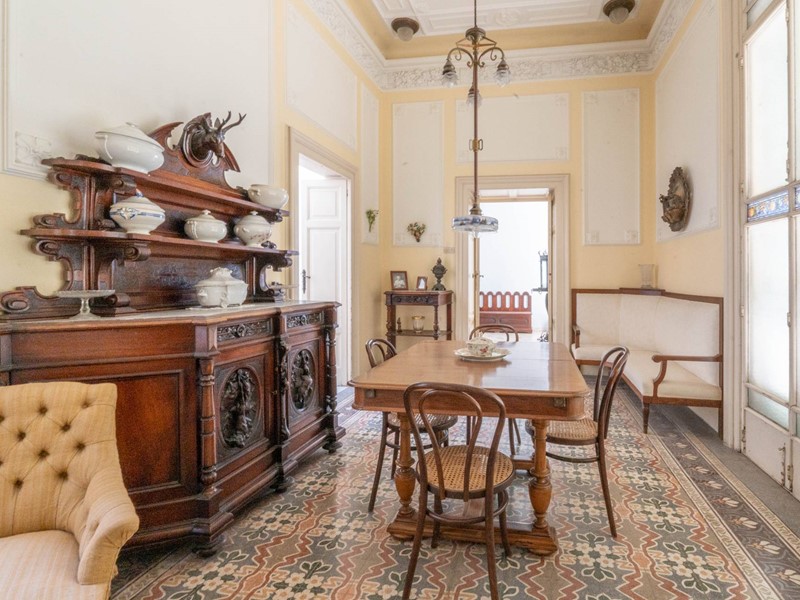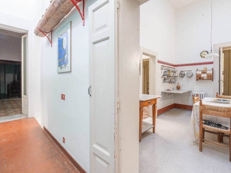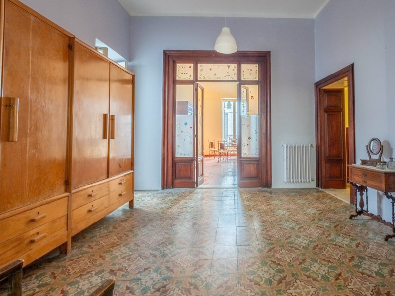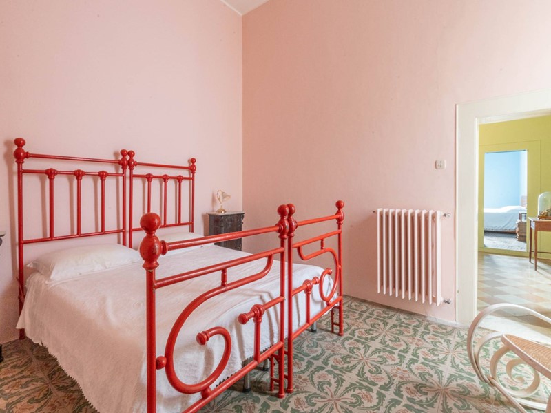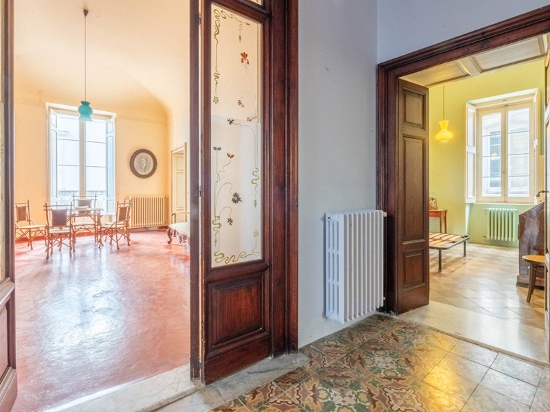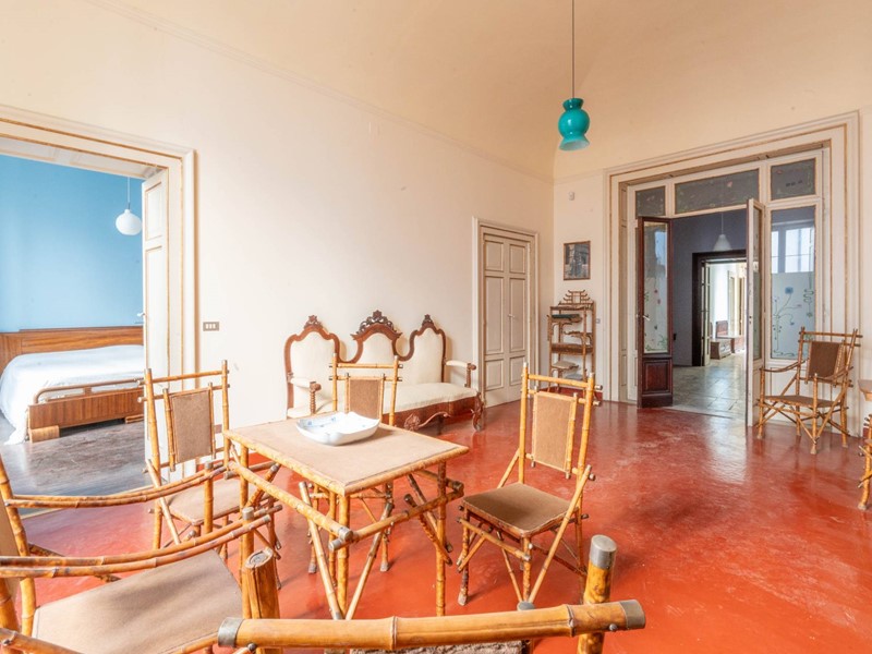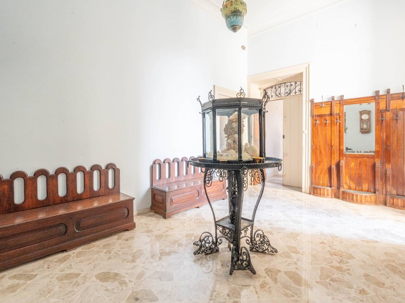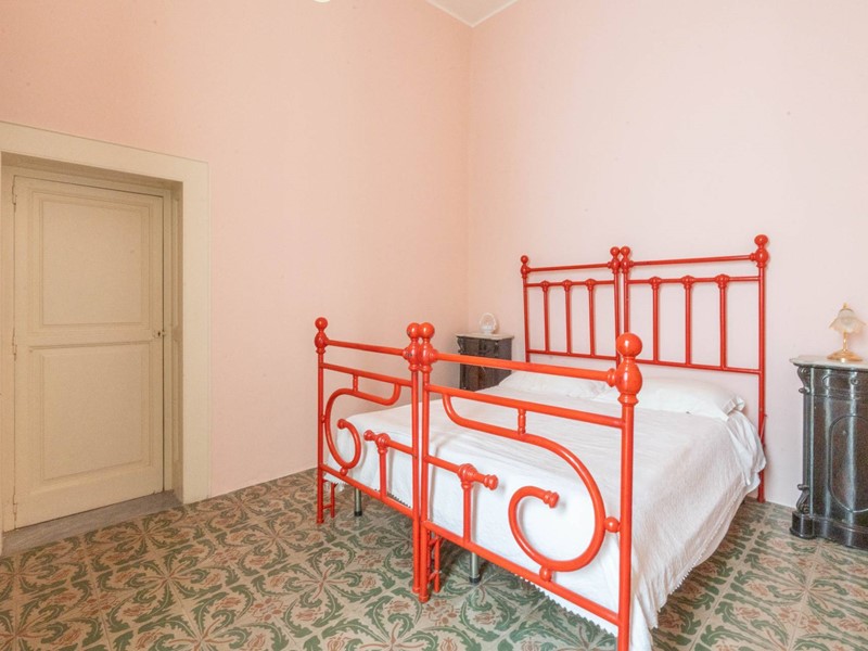 Particolarmente eleganti gli ambienti al piano primo (raggiungibili da una importante scalinata rivestita in pietra che comunica tutti i livelli del palazzo) caratterizzati da disegni geometrici e colorate cementine antiche che ricoprono tutte le stanze, oltre ad una antica cucina realizzata in muratura e rivestita in rame ed un bellissimo camino in pietra. Sono ben 350 circa i metri quadrati di questo piano del palazzo, suddivisi in 16 vani oltre accessori, oltre ad una generosa terrazza che si affaccia sulla rinomata Piazza Umberto I.