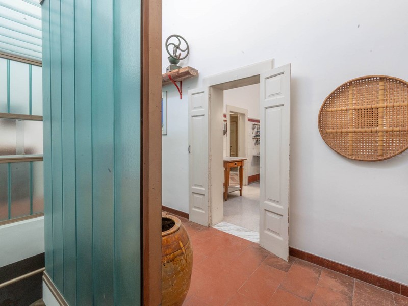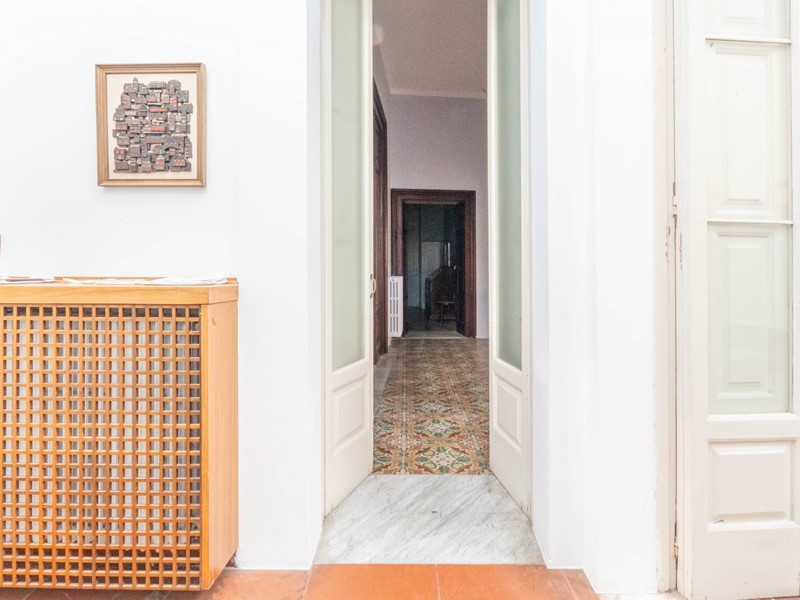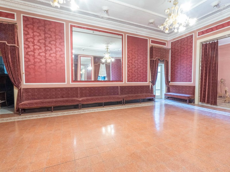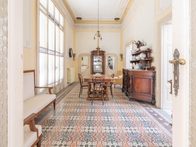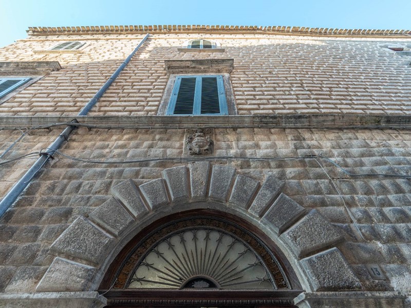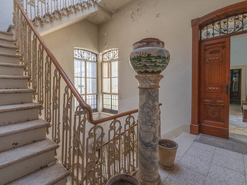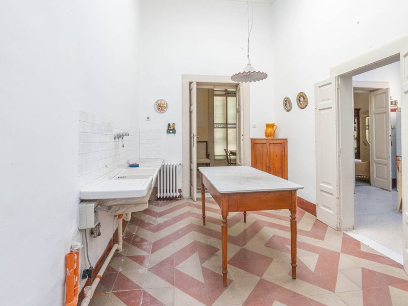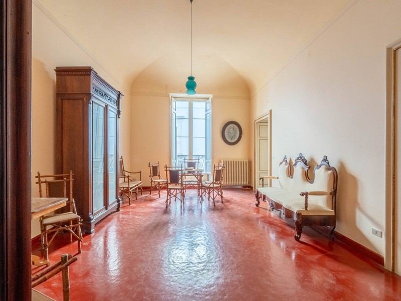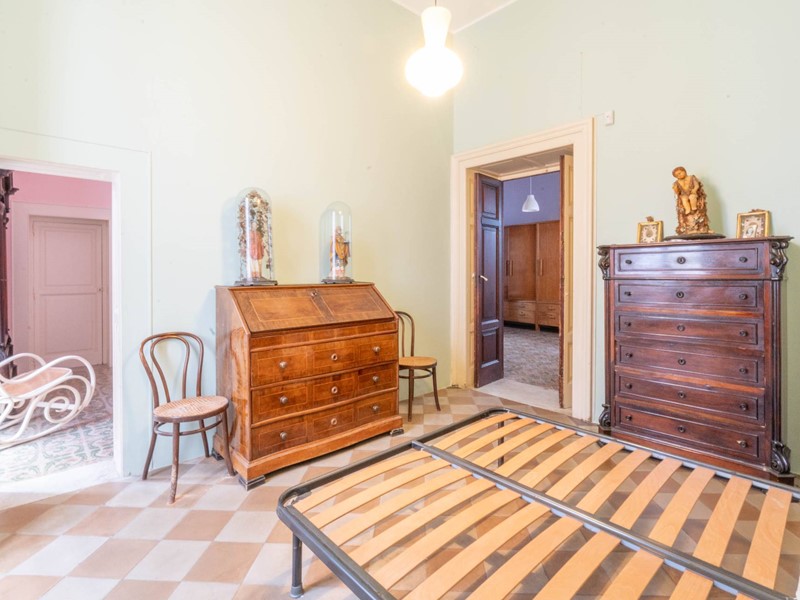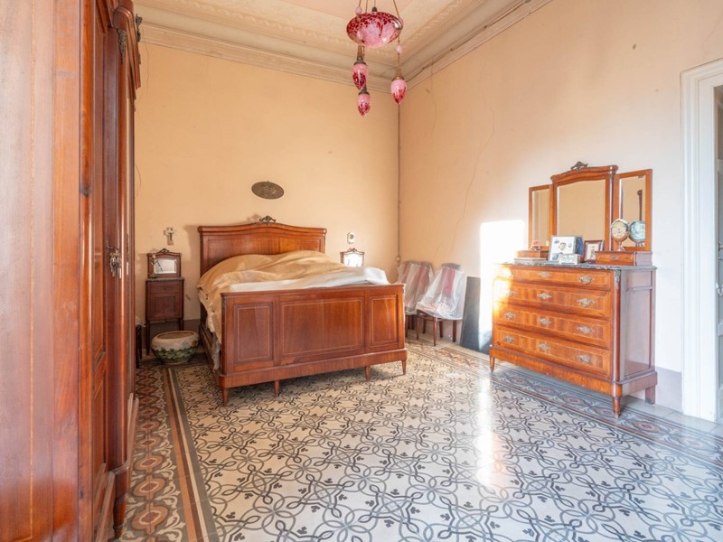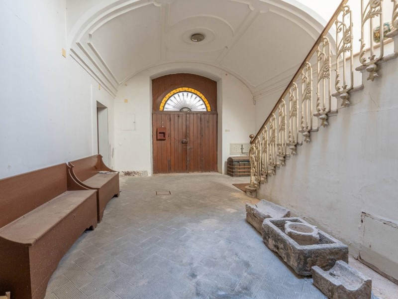 Particolarmente eleganti gli ambienti al piano primo (raggiungibili da una importante scalinata rivestita in pietra che comunica tutti i livelli del palazzo) caratterizzati da disegni geometrici e colorate cementine antiche che ricoprono tutte le stanze, oltre ad una antica cucina realizzata in muratura e rivestita in rame ed un bellissimo camino in pietra. Sono ben 350 circa i metri quadrati di questo piano del palazzo, suddivisi in 16 vani oltre accessori, oltre ad una generosa terrazza che si affaccia sulla rinomata Piazza Umberto I.