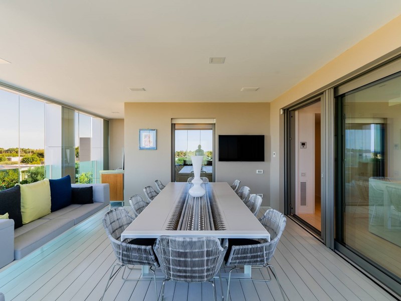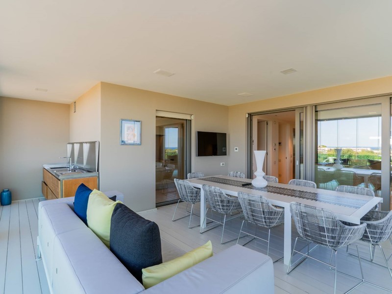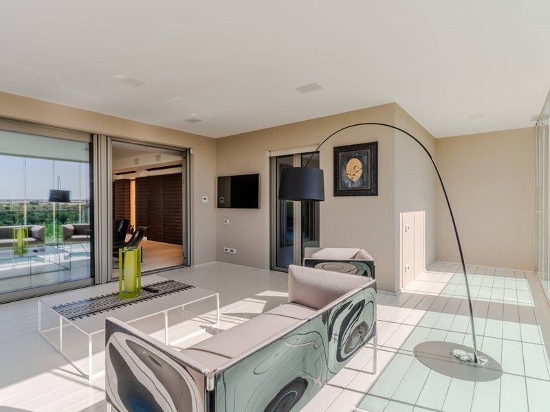 Gli interni sono rifiniti con materiali di altissima qualità, il pavimento interno è in rovere Croazia prima scelta con finitura bianca, donando agli spazi uneleganza naturale e contemporanea. Allesterno, le terrazze panoramiche sono rivestite con larice siberiano prima scelta, anchesso con finitura bianca, perfetto per vivere loutdoor in armonia con il paesaggio circostante.